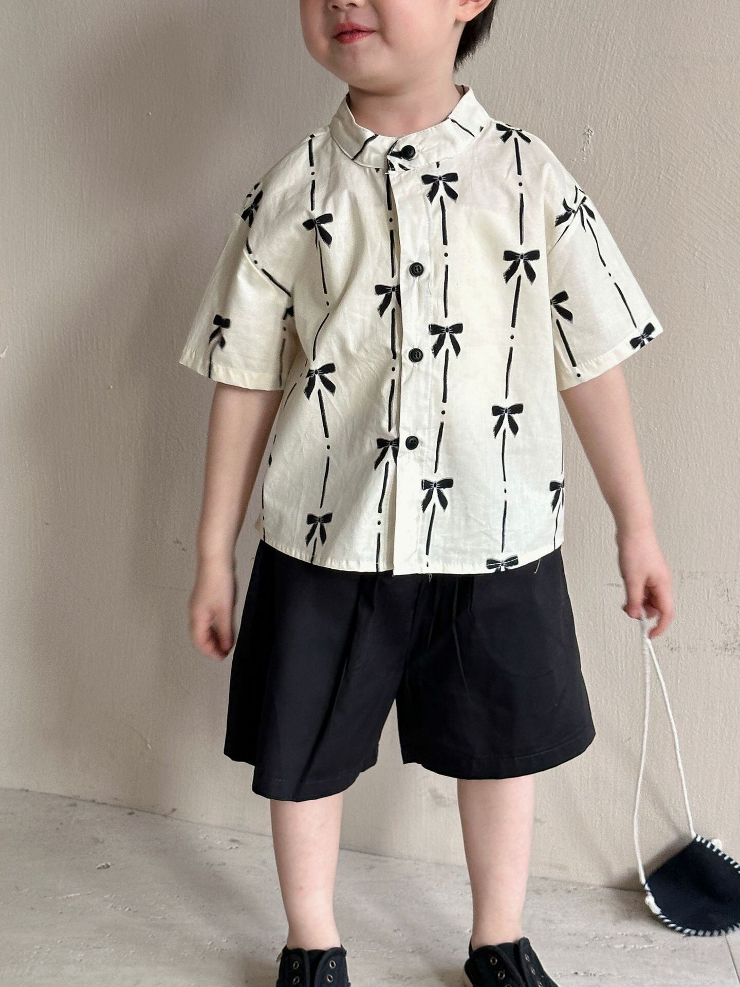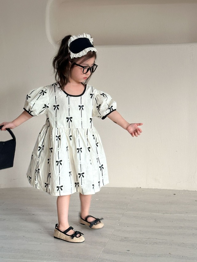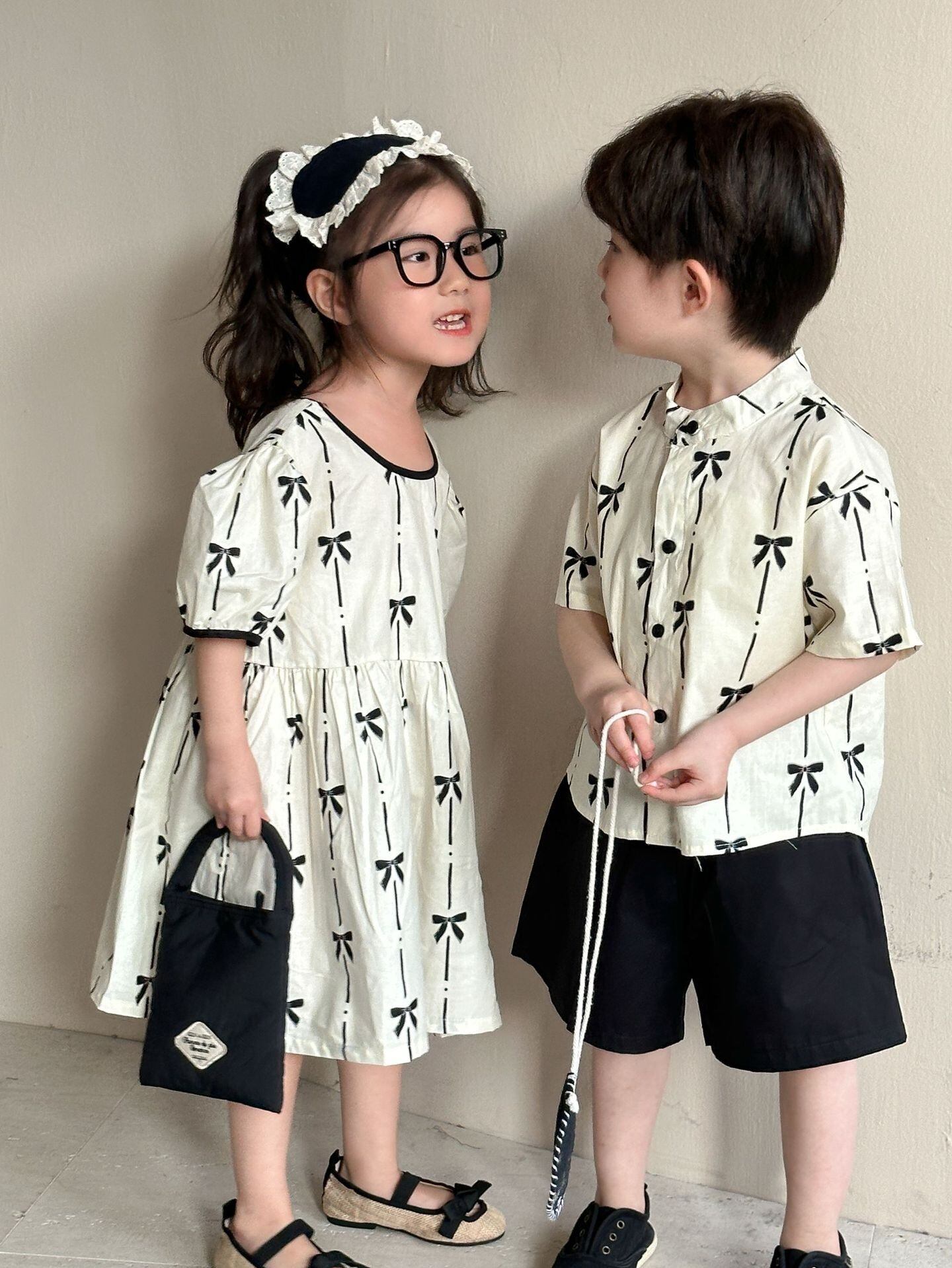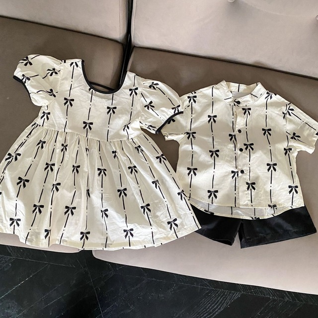 《取寄》 リボン柄モノクロセットアップとワンピース (ホワイト) QQMM 2025夏 韓国子供服 上下セット ワンピース セット シャツ ハーフパンツ りぼん 白黒 リンクコーデ (80~150cm)