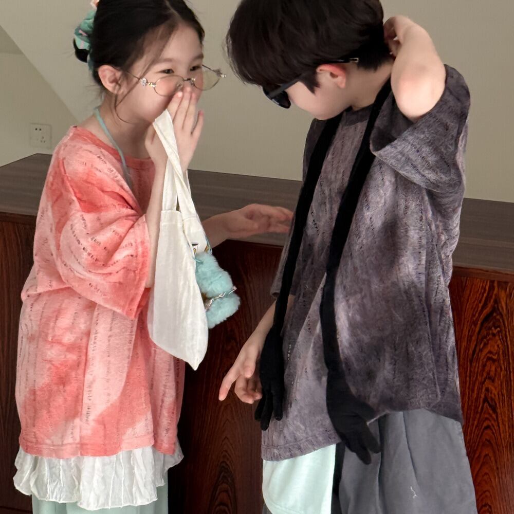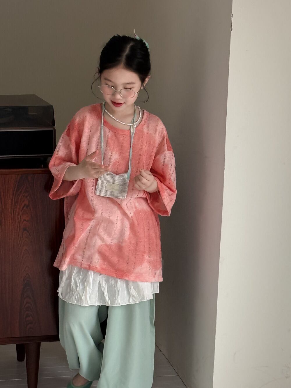 《取寄》タイダイオーバーサイズTシャツ (ピンク/チャコール) KMAI 2025夏 韓国子供服 トップス カットソー Tシャツ ビッグシルエット ムラ染め ストライプ 古着風 (90~150cm)