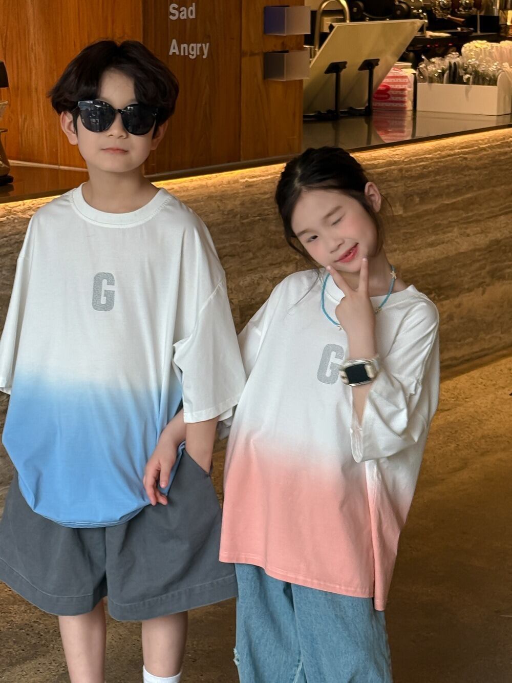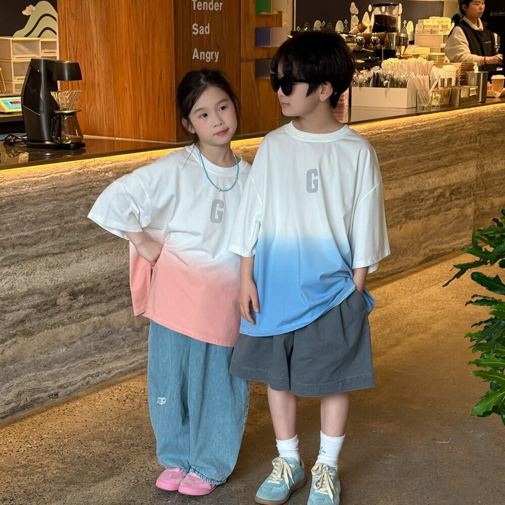 《取寄》グラデーションカラーTシャツ (ピンク/ブルー) KMAI 2025夏 韓国子供服 トップス カットソー Tシャツ 半袖 オーバーサイズ ロゴ (90~150cm)