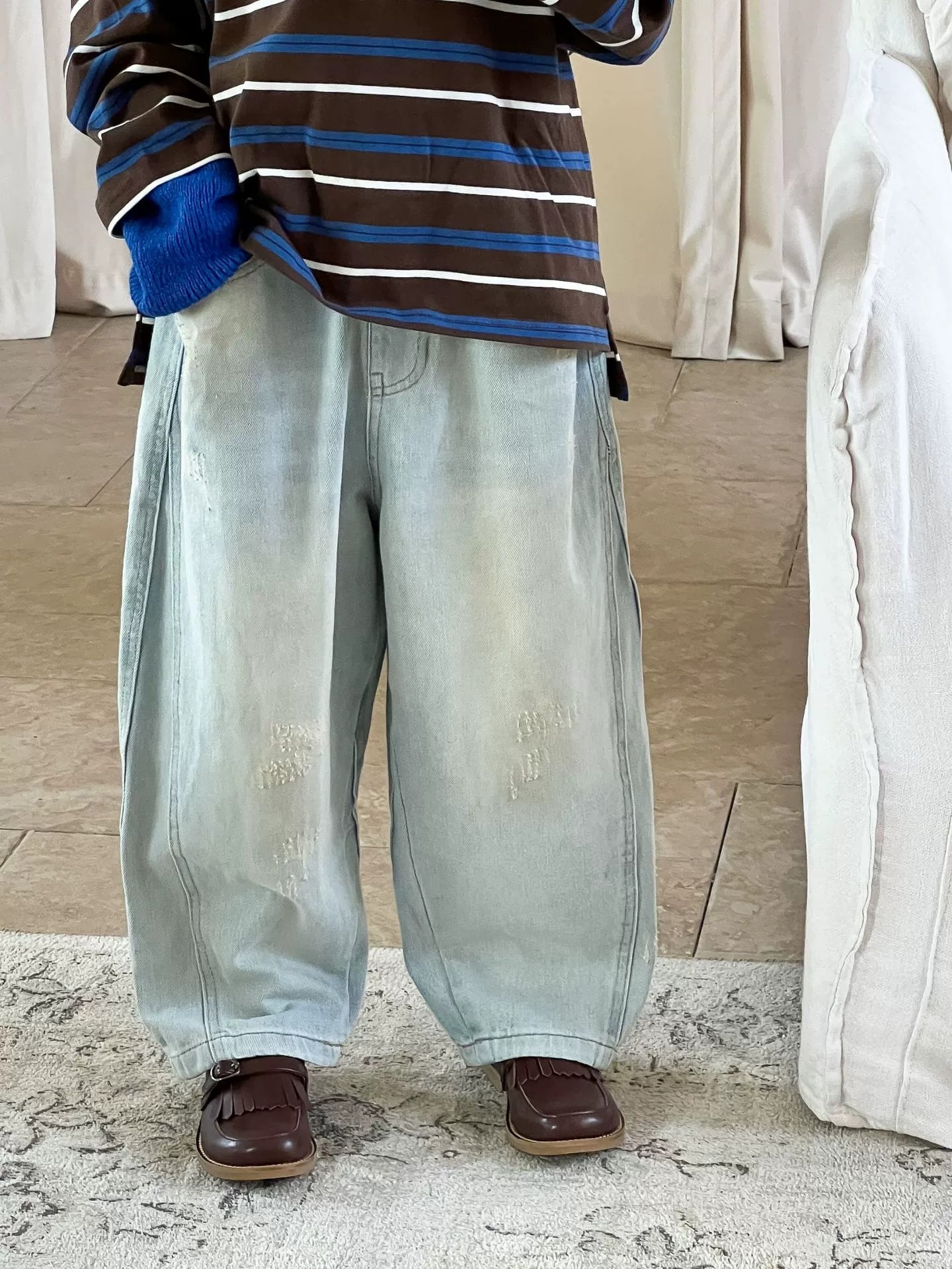 《取寄》ダメージ加工デニムパンツ (ウォッシュブルー) XDJK 2025秋 韓国子供服 ボトムス パンツ ジーパン ジーンズ ユーズドライク クラッシュジーンズ (90~150cm)