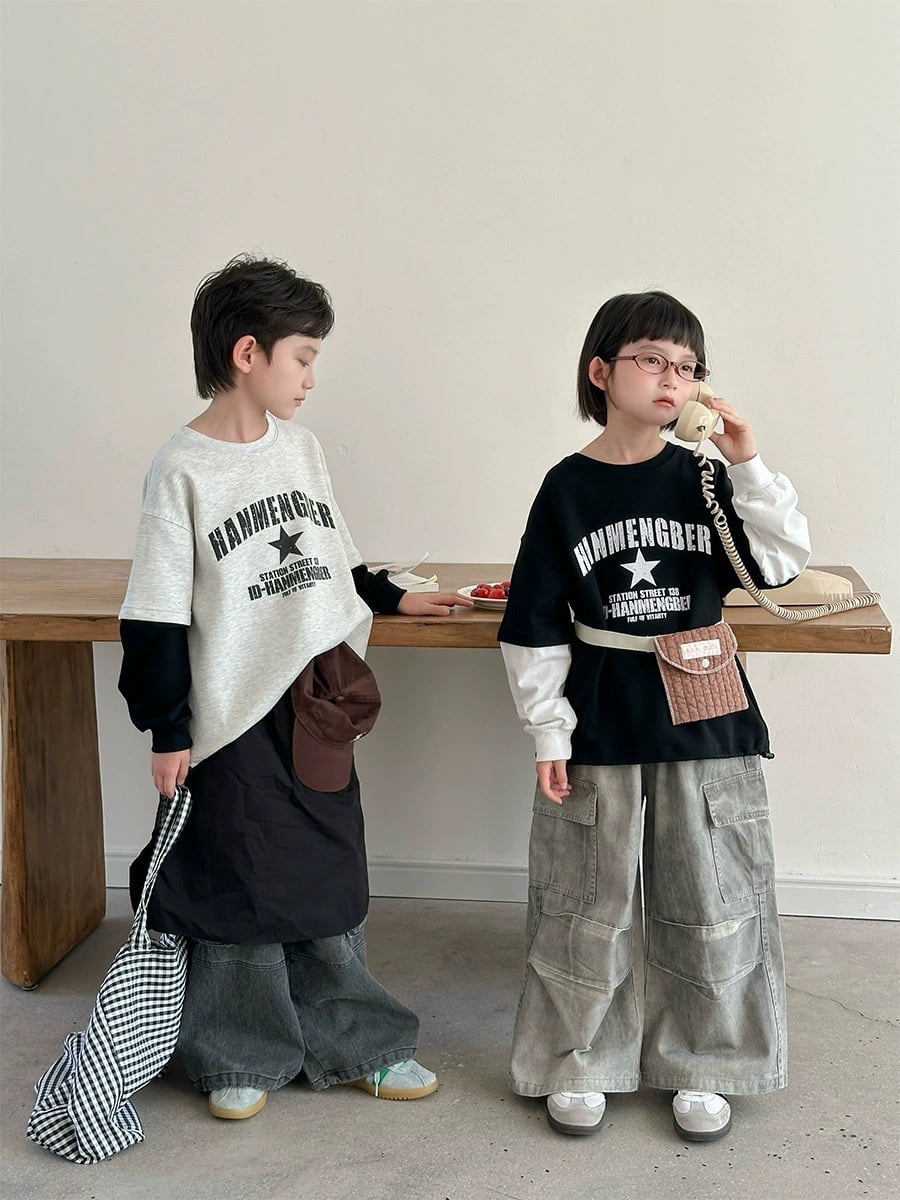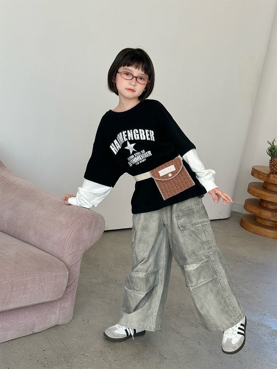 《取寄》フェイクレイヤード長袖Tシャツ (ブラック/ホワイトグレー) XDJK 2025秋 韓国子供服 トップス カットソー Tシャツ ロングスリーブ ロンT プリントT 重ね着風 (90~150cm)