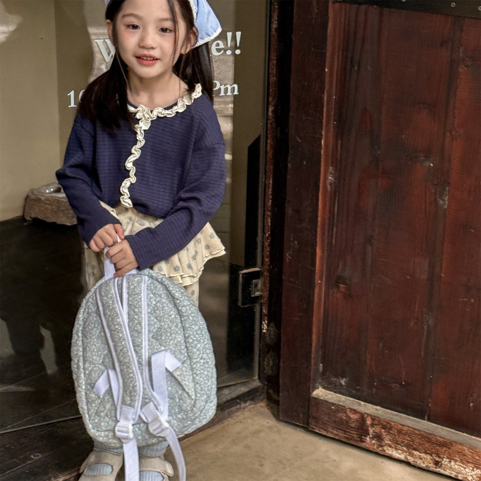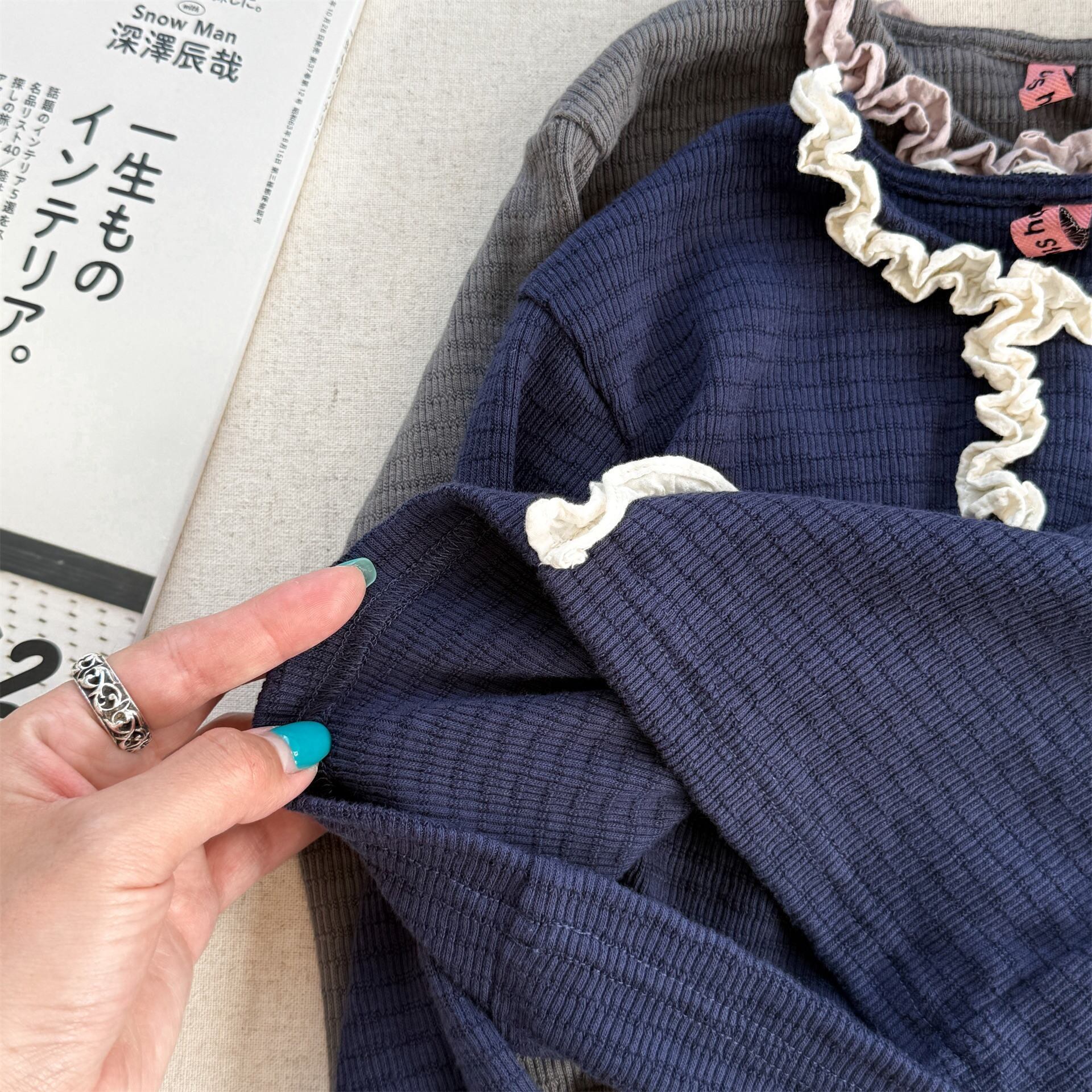 《取寄》 フロントフリルレーストップス (ネイビー/グレー) ADBB 2025秋 韓国子供服 トップス カットソー ロンT 長袖 フリル 伸縮性 女の子 (80~130cm)