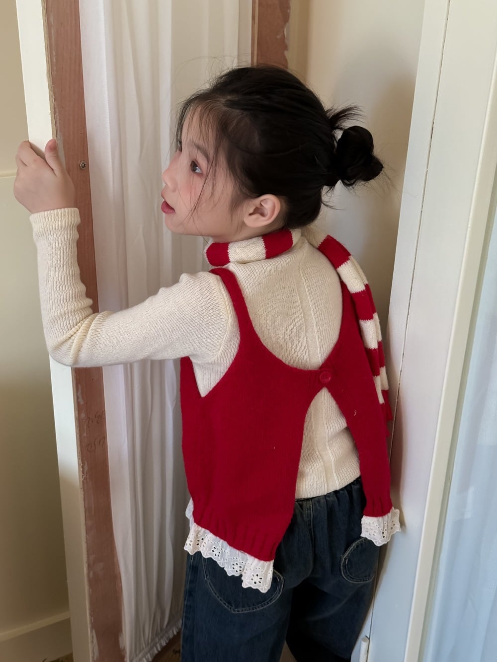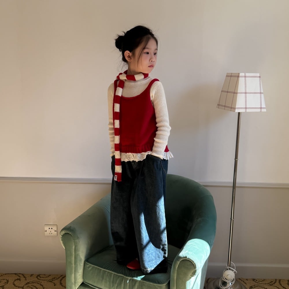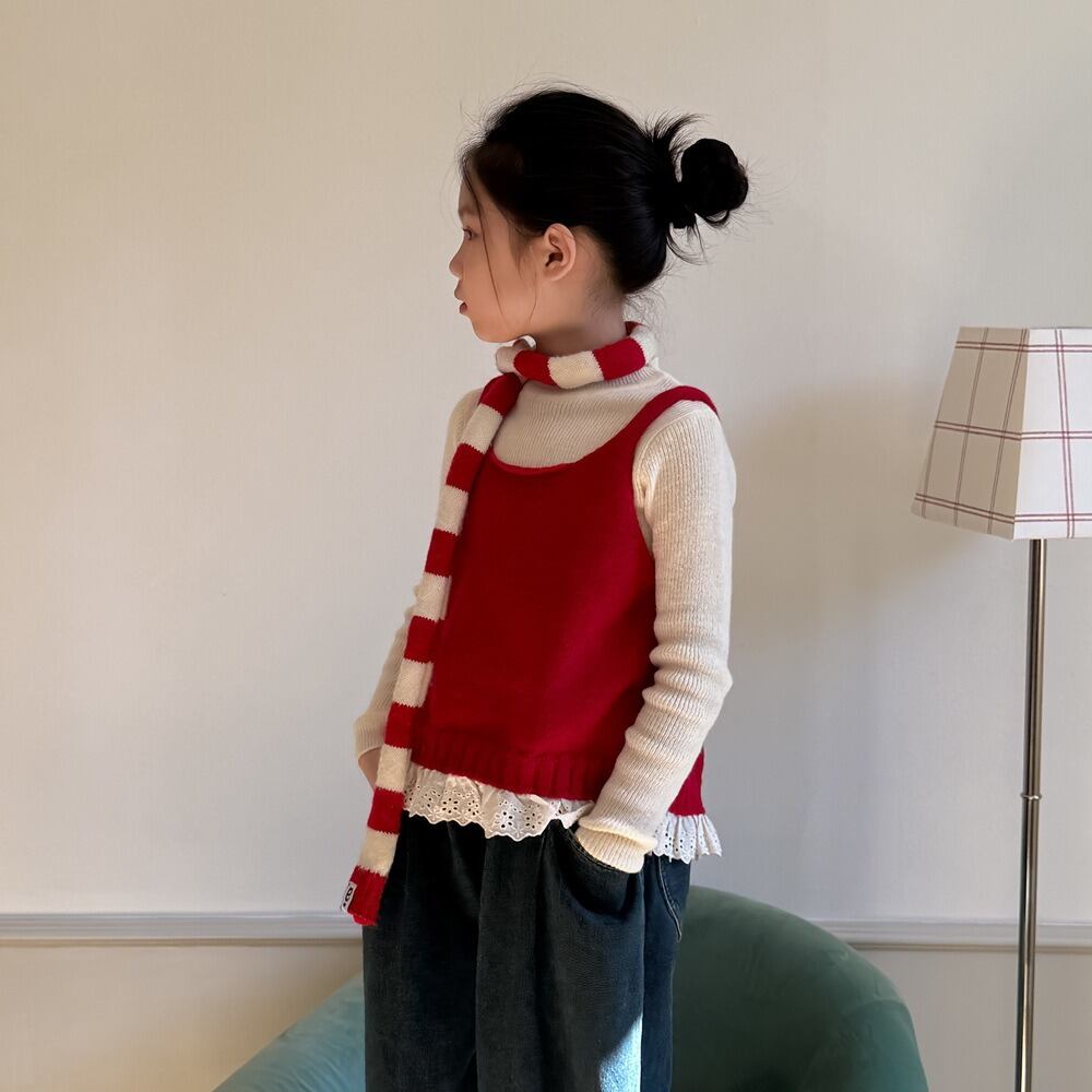 《取寄》裾レースノースリーブニットトップス (レッド) KMAI 2025秋 韓国子供服 トップス カットソー 重ね着 ベスト レイヤード (90~150cm)