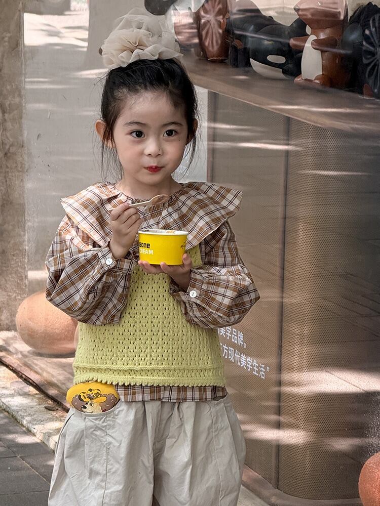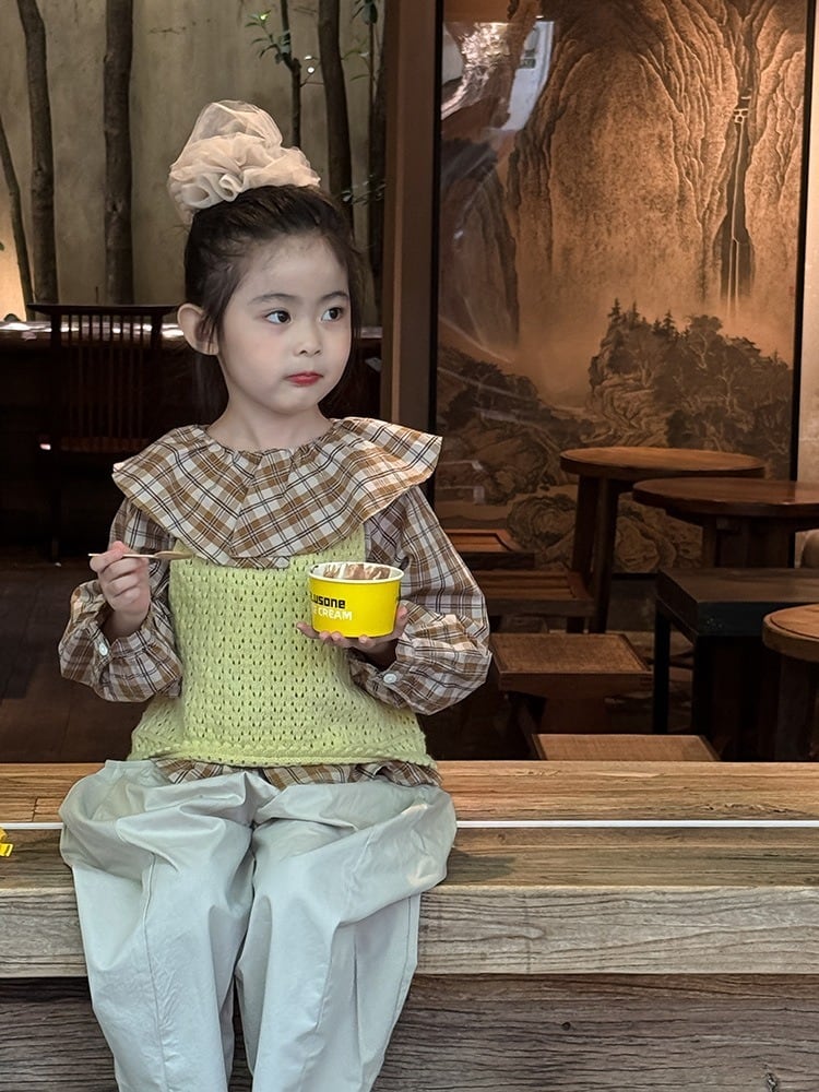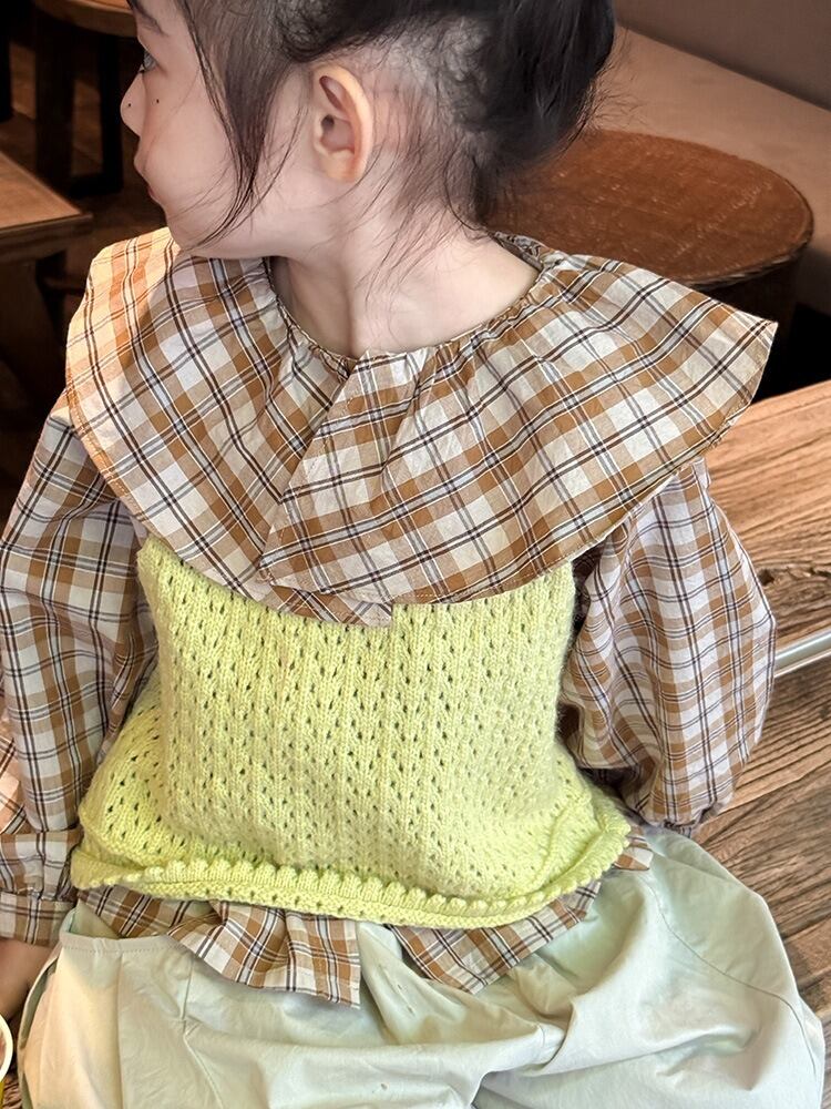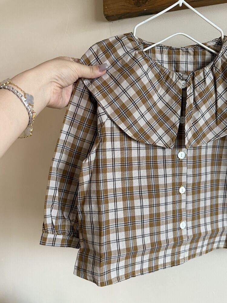 《取寄》 チェック柄ラペル襟ブラウス (ベージュ) BOBI 2025秋 韓国子供服 トップス カットソー シャツ ブラウス ギンガムチェック ビッグカラー 女の子 (90~150cm)