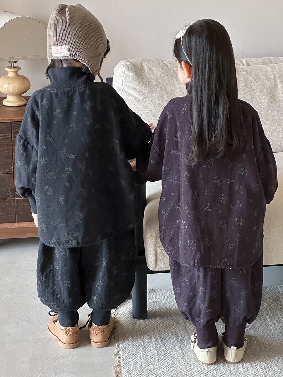 《取寄》 花柄リブセットアップ (ネイビー/パープル) JIAY 2025秋 韓国子供服 セット 上下 裾絞り ポロ 小花 (80~140cm)