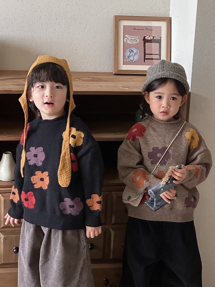 《取寄》 レトロフラワーニットセーター (ブラック/モカ) JIAY 2025秋 韓国子供服 トップス セーター ニット プルオーバー レトロ お花 (80~140cm)