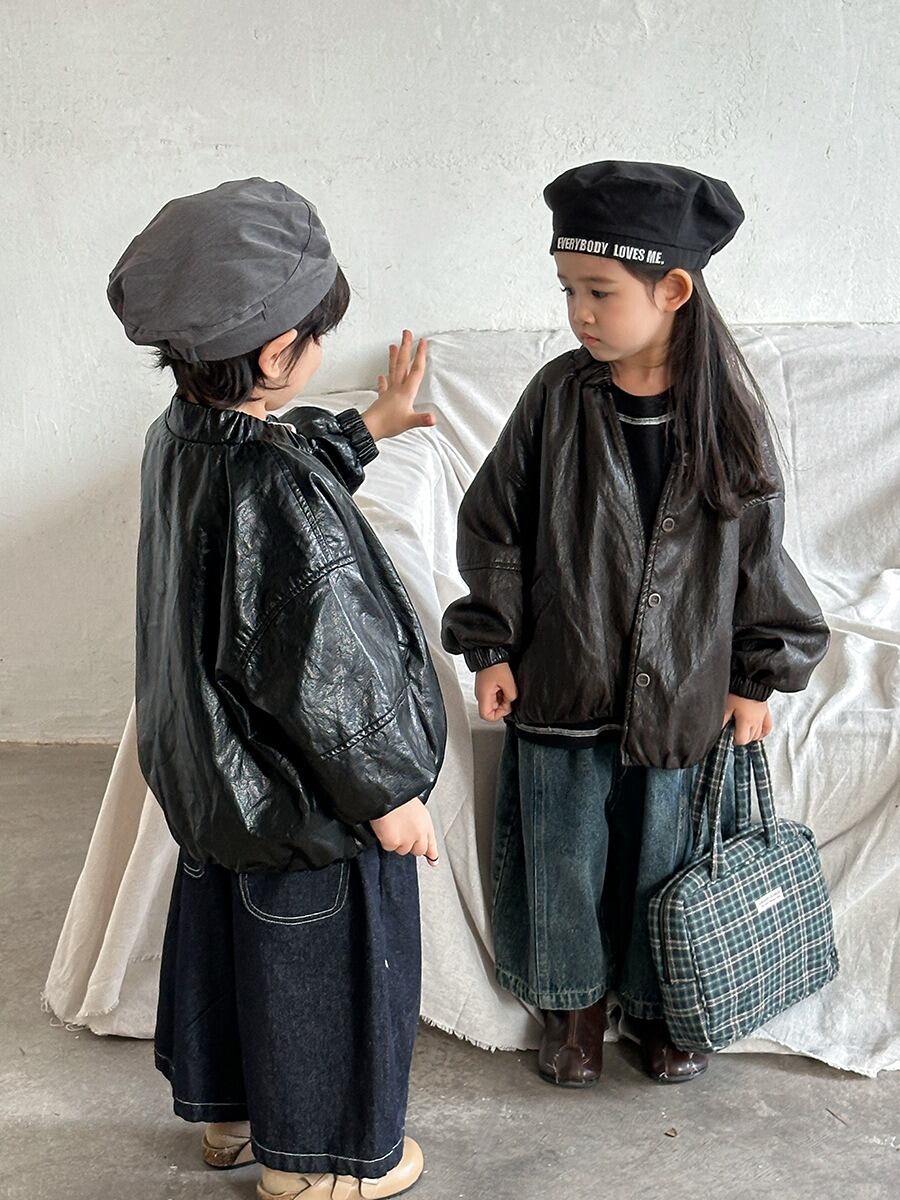 《取寄》 ジップアップPUレザージャケット (ブラック/ブラウン) JIAY 2025秋 韓国子供服 アウター ジャケット パーカー 上着 フェイクレザー (80~140cm)
