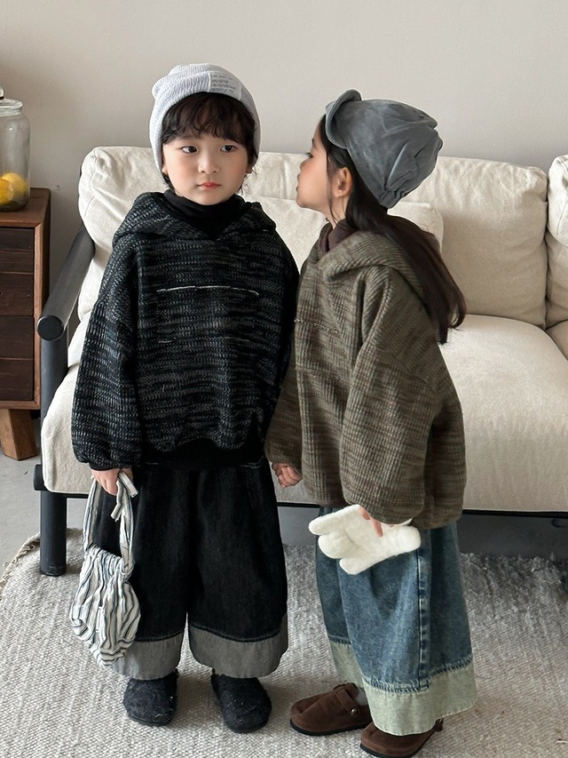 《取寄》 ニット混フーディー (ブラック/カーキ) JIAY 2025秋 韓国子供服 トップス プルオーバー パーカー フード オーバーサイズ (80~140cm)