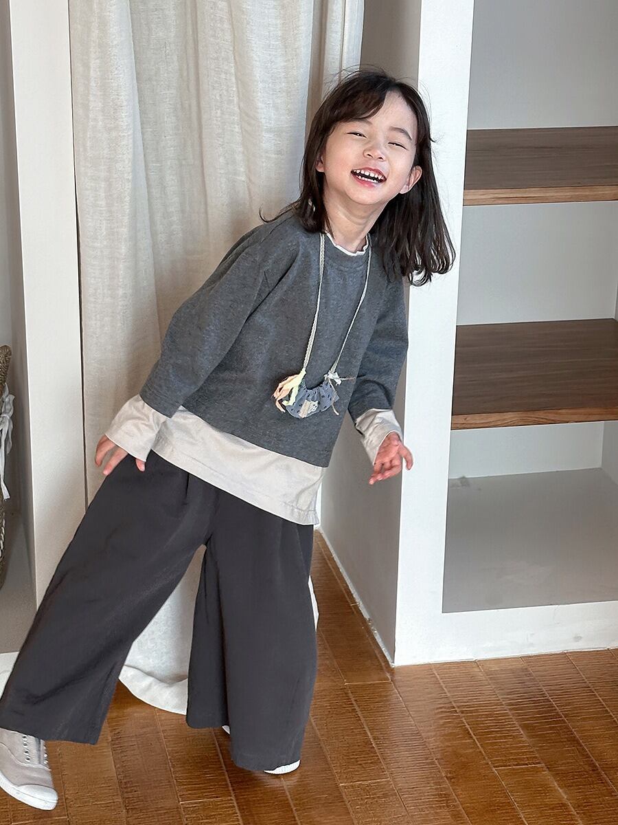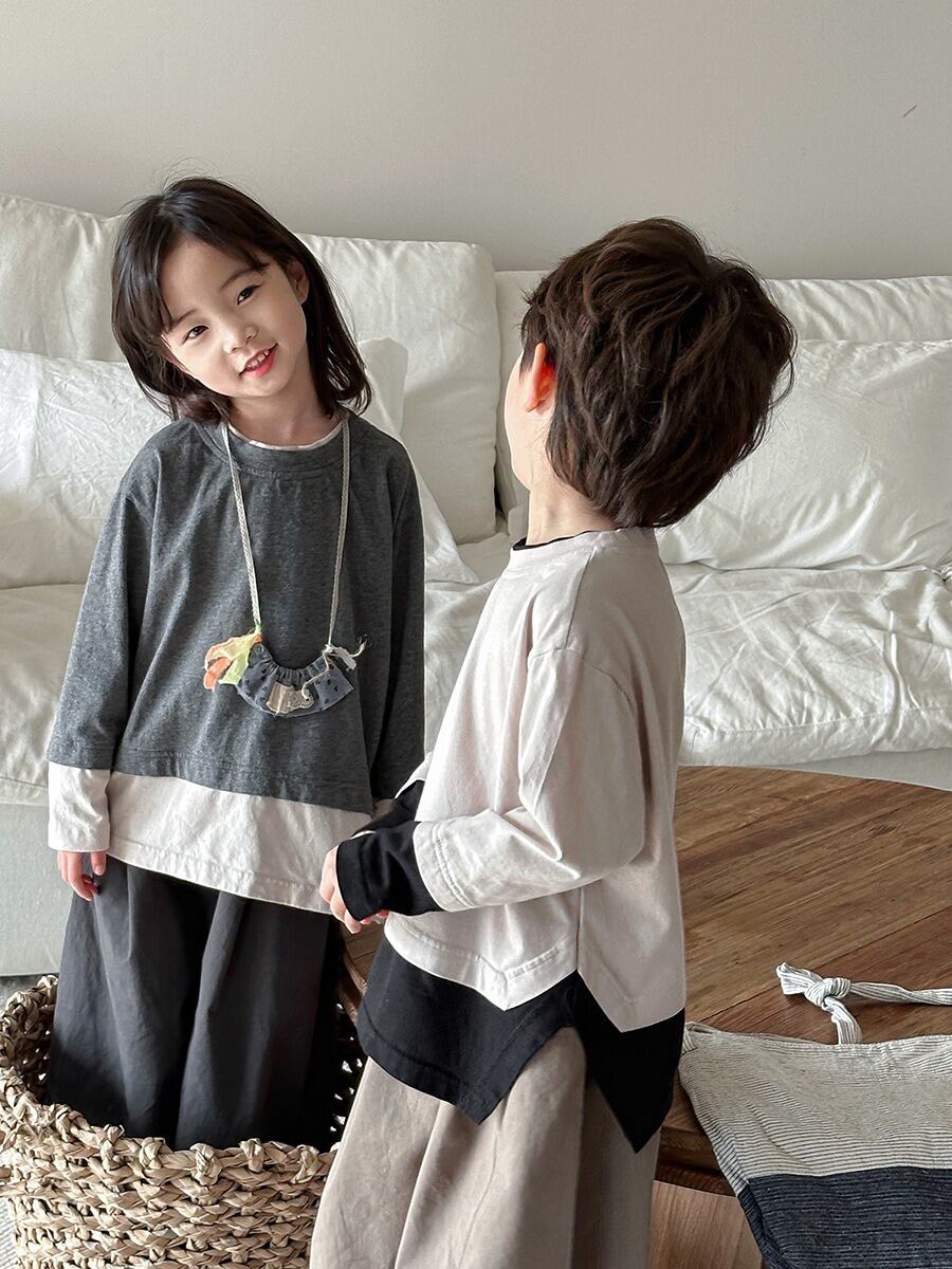 ★即納★ バイカラーレイヤード風カットソー/140 (グレー) 【送料無料】 JIAY 2025春 韓国子供服 トップス Tシャツ カットソー ロンT 長袖 切替 ツートン
