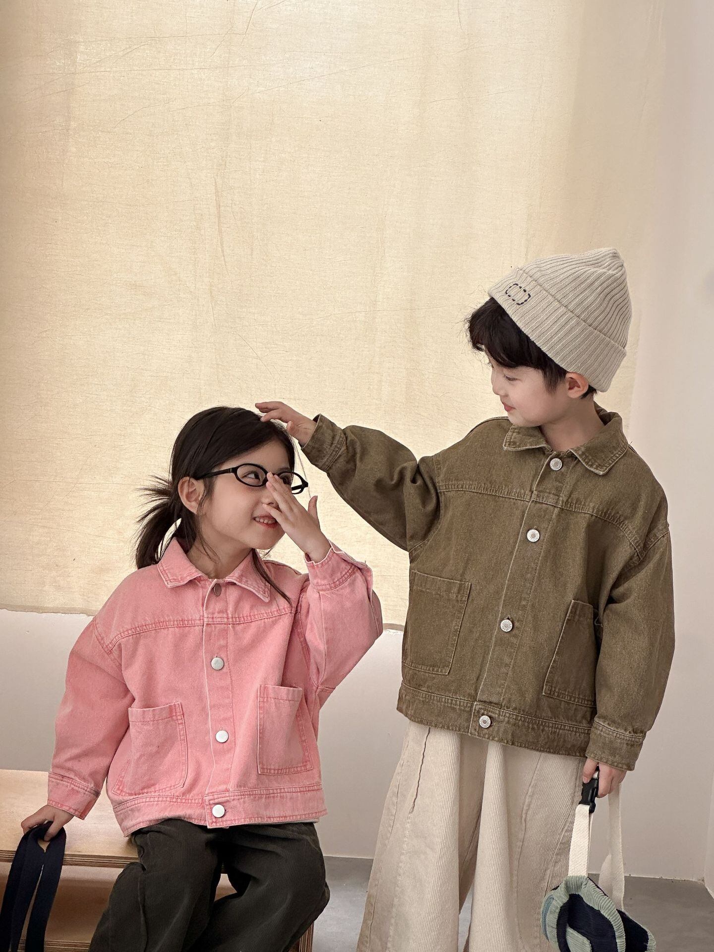 《取寄》 カラーデニムジャケット (ピンク / カーキ) QQMM 2025秋 韓国子供服 アウター ジャケット カーディガン 上着 Gジャン デニム (80~150cm)