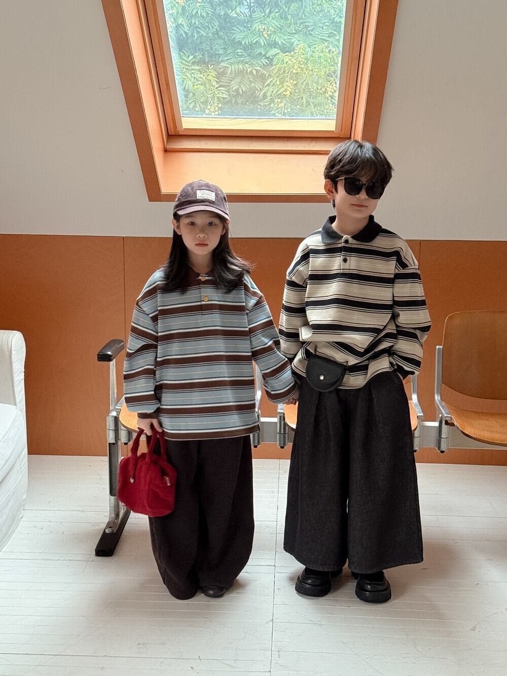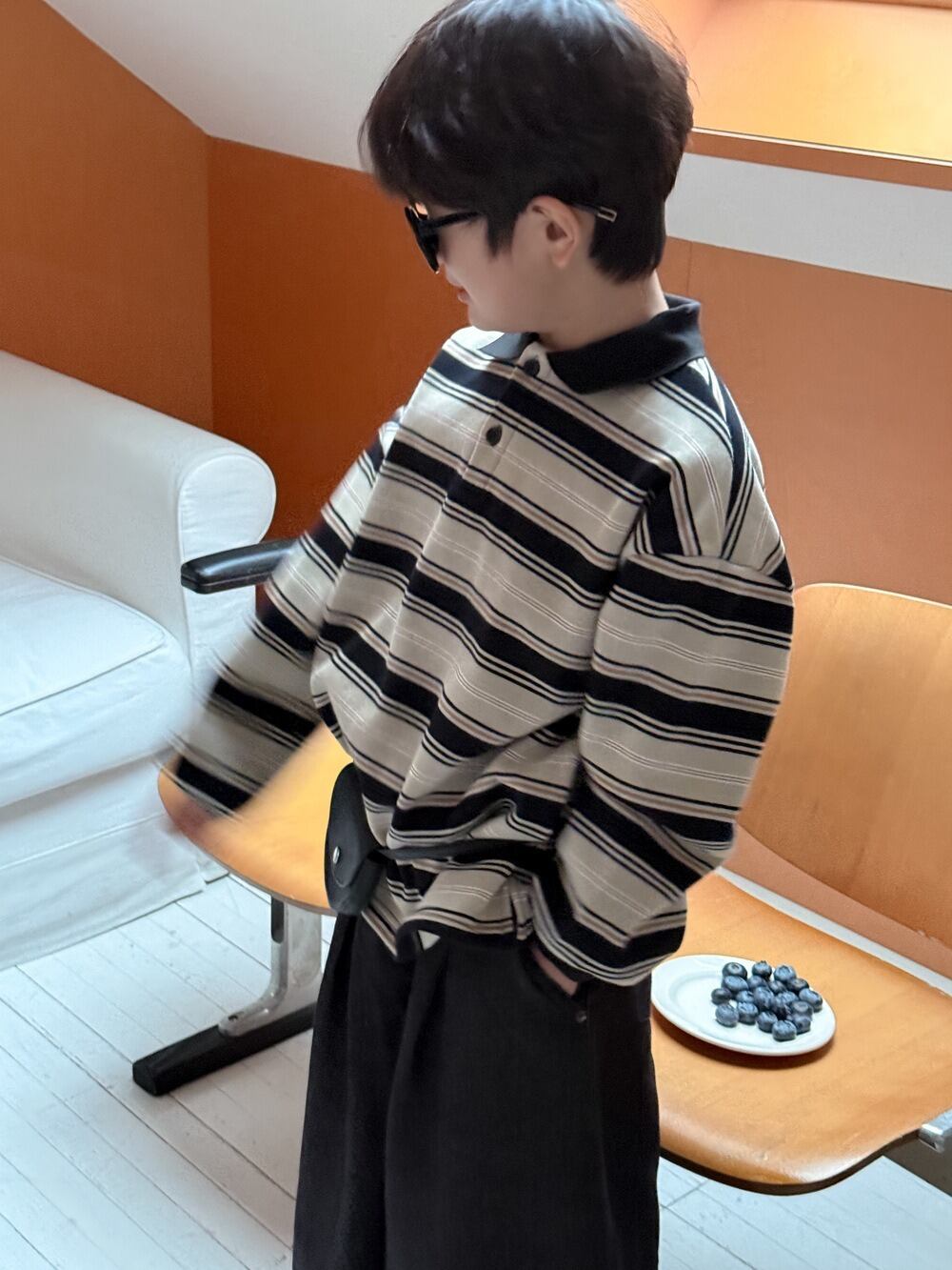 《取寄》マルチボーダー長袖ポロシャツ (スカイ / ブラック) KMAI 2025冬 韓国子供服 トップス カットソー polo ロンT オーバーサイズ (90~150cm)