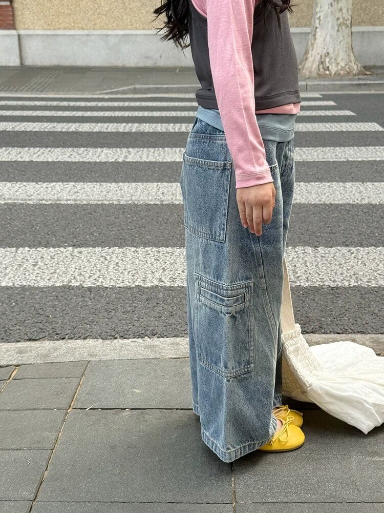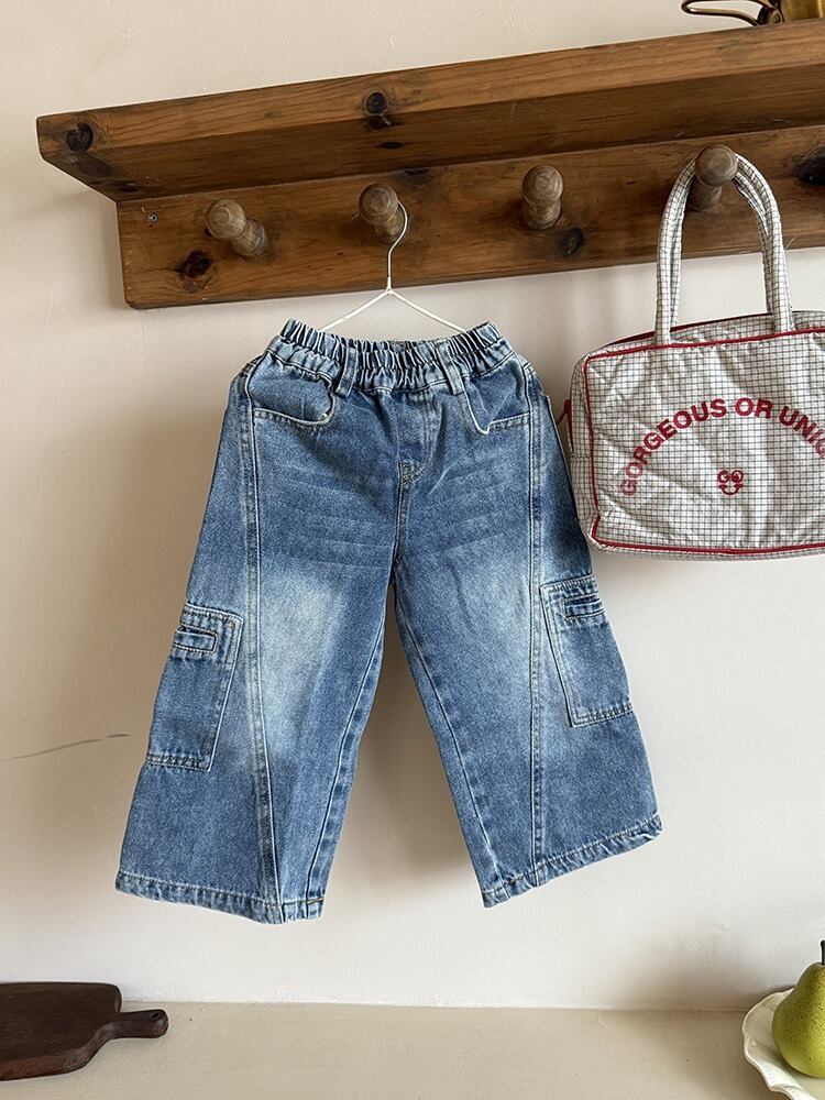 ★即納★ カーゴデニムパンツ (ブルー) /150 【送料無料】【アウトレット】 BOBI 2025秋 韓国子供服 ボトムス ズボン ジーパン ジーンズ ワイドストレート オーバーサイズ カーゴパンツ