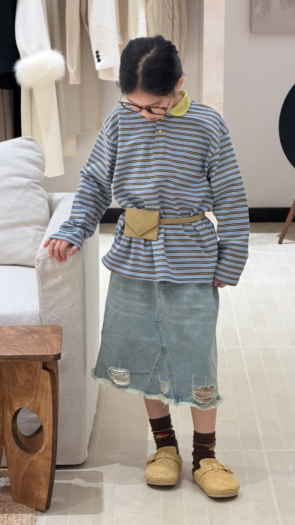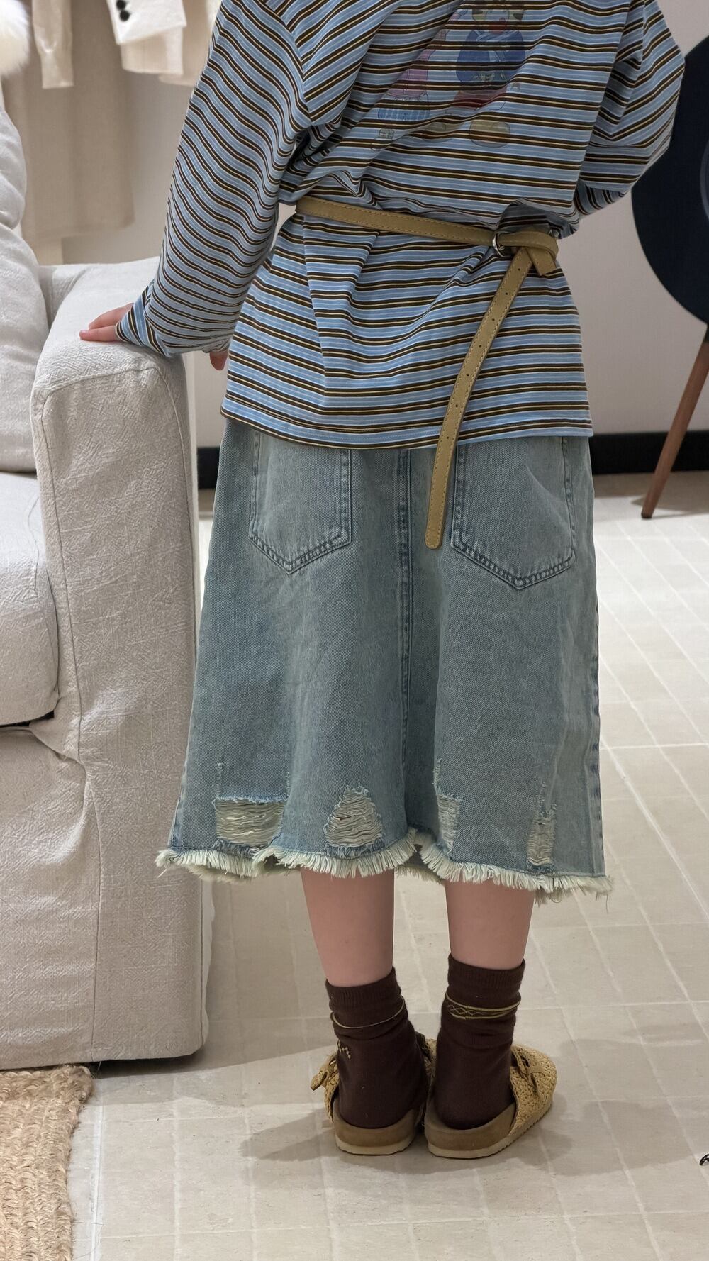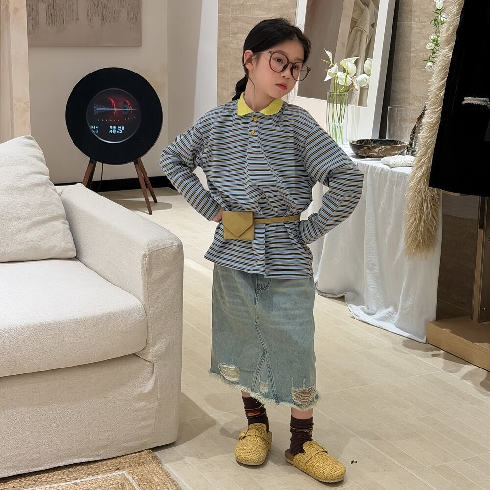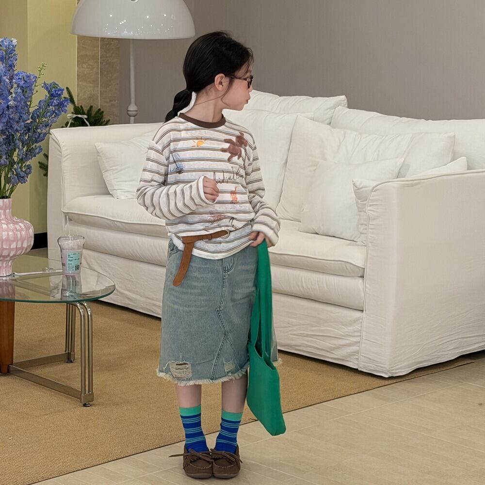 クラッシュデニムスカート(ウォッシュブルー)KMAI 2026春|100-160cm|ダメージデニム|ミディ丈|古着風 [取寄]
