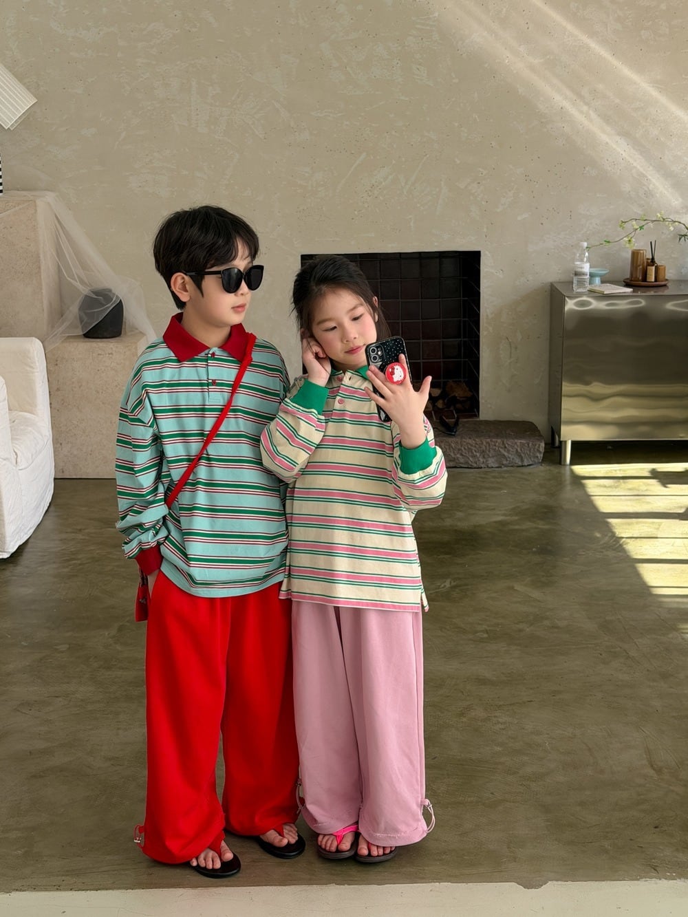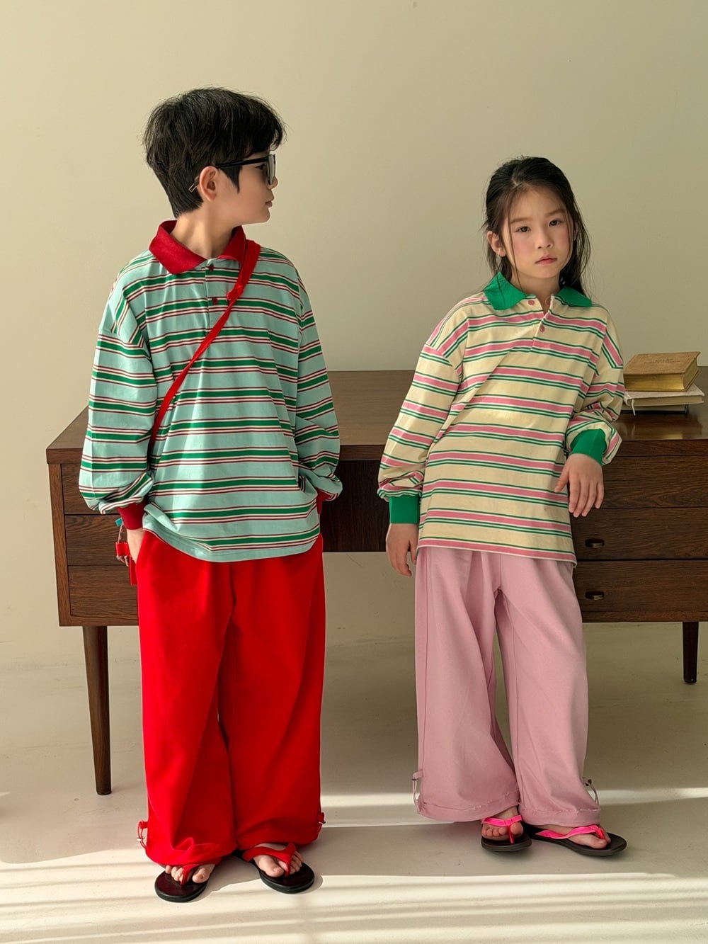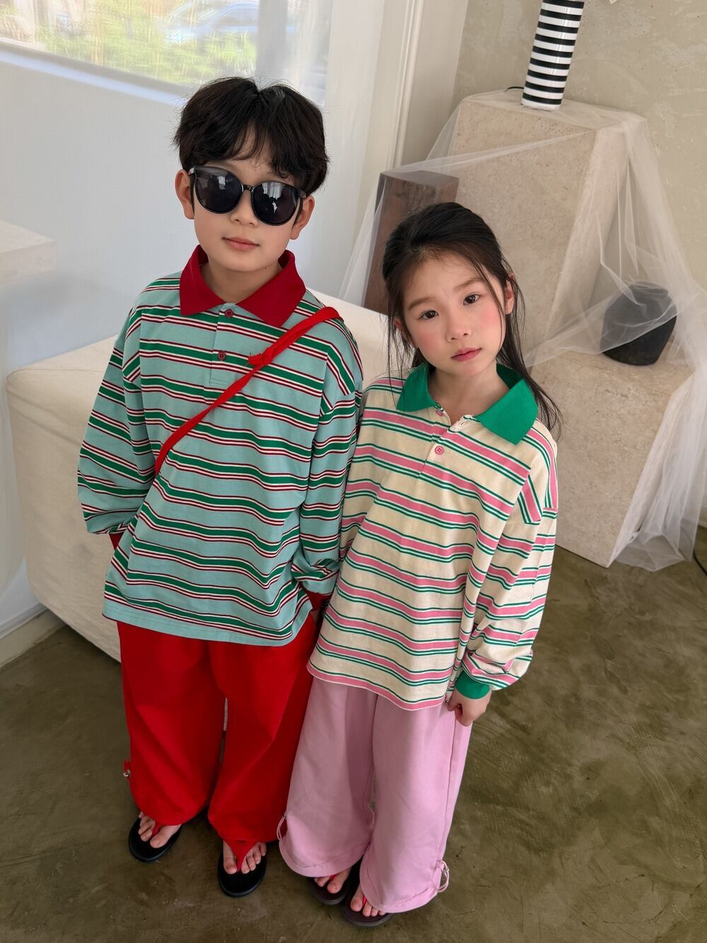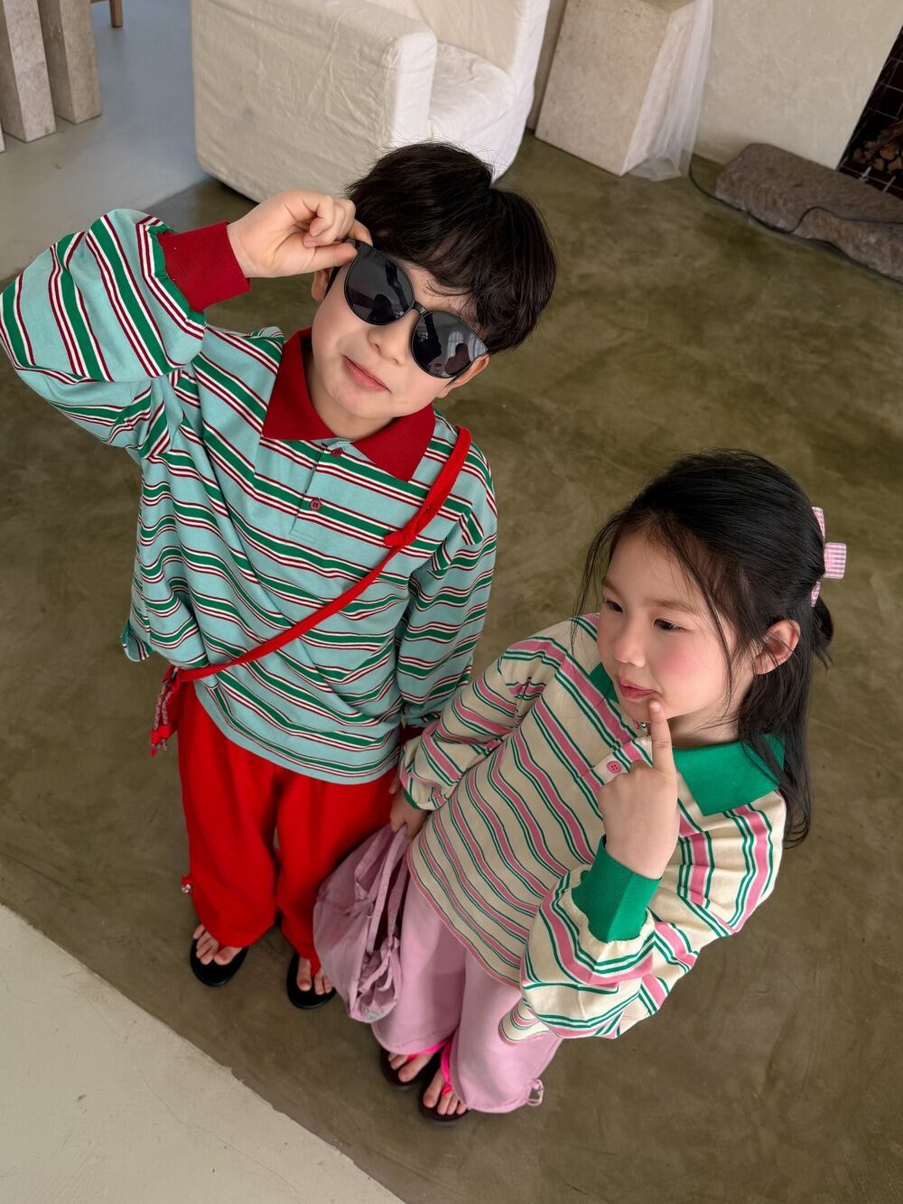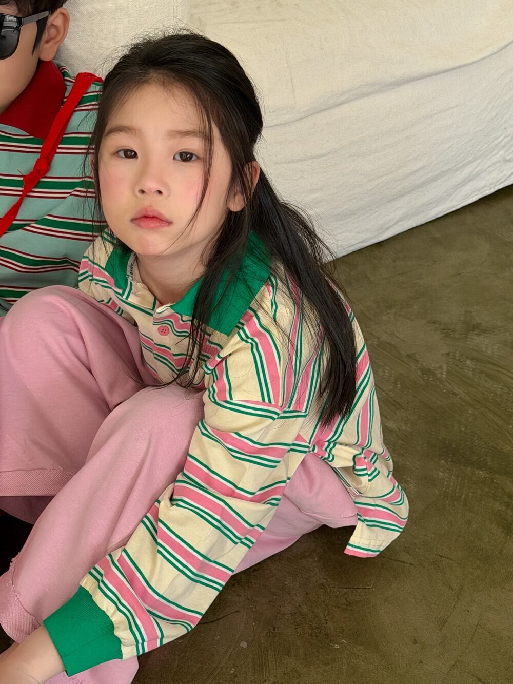 マルチボーダーポロシャツ(グリーン/イエロー)KMAI 2026春|100-160cm|トップス|長袖|ラガーシャツ [取寄]