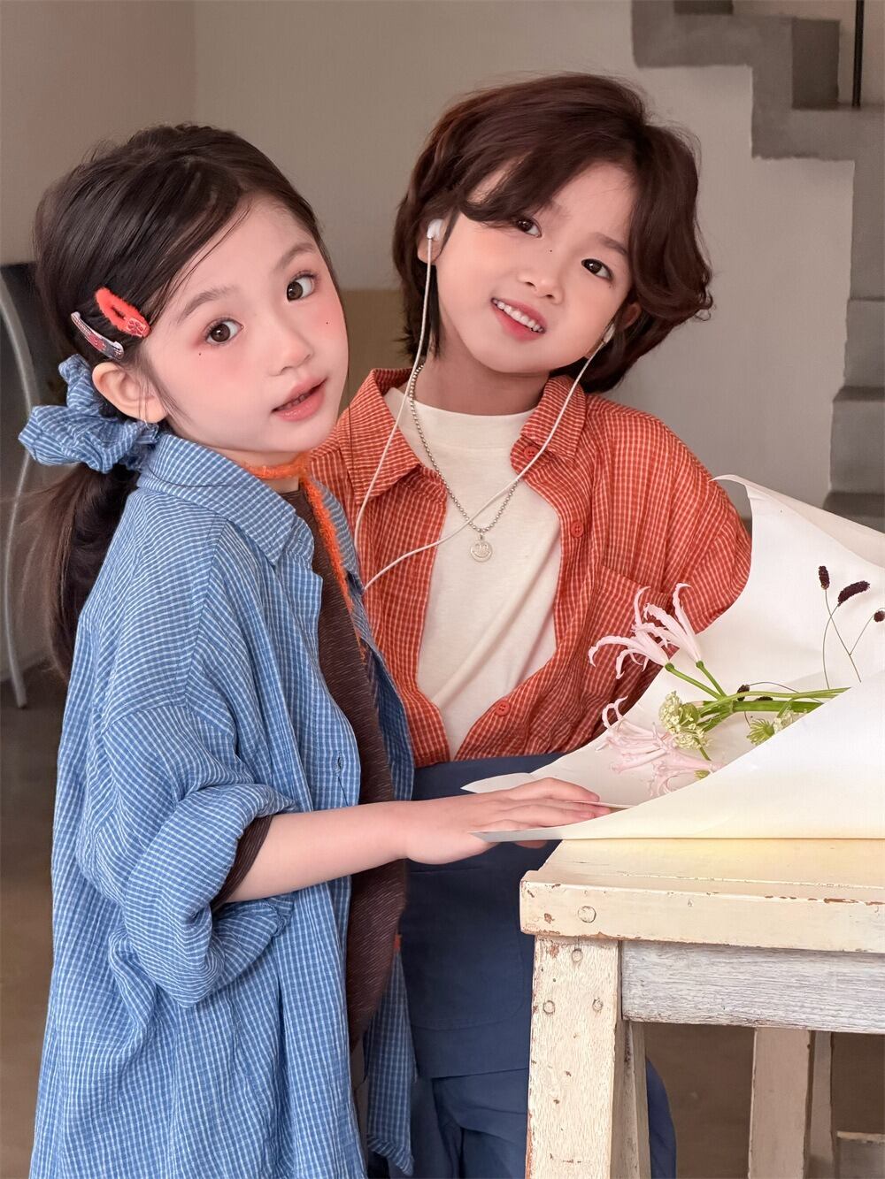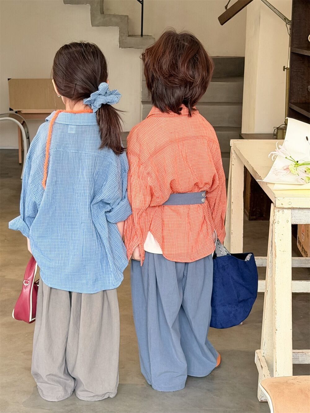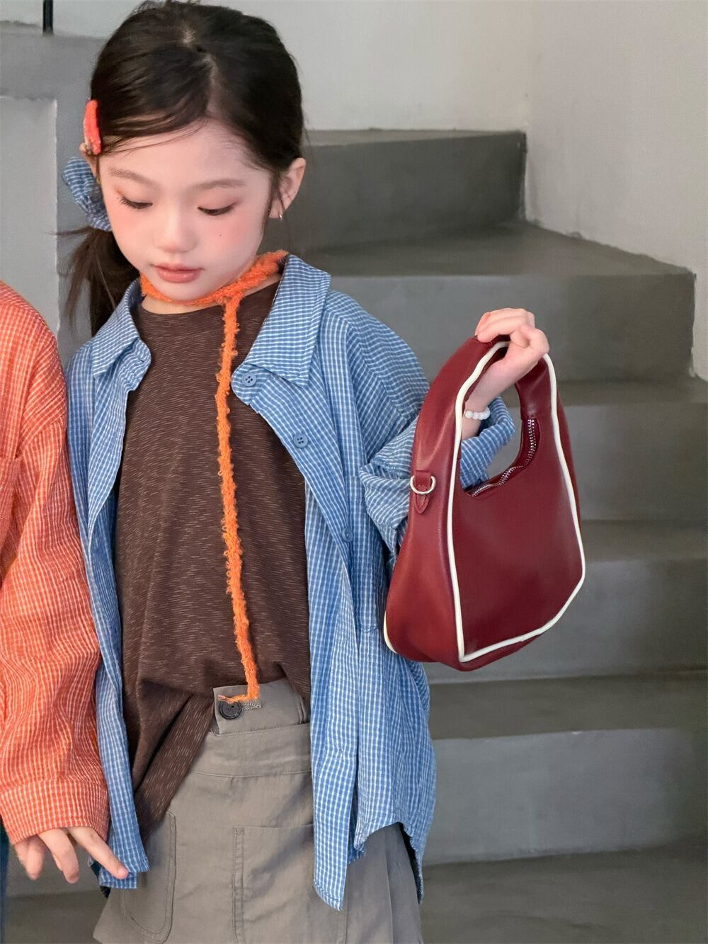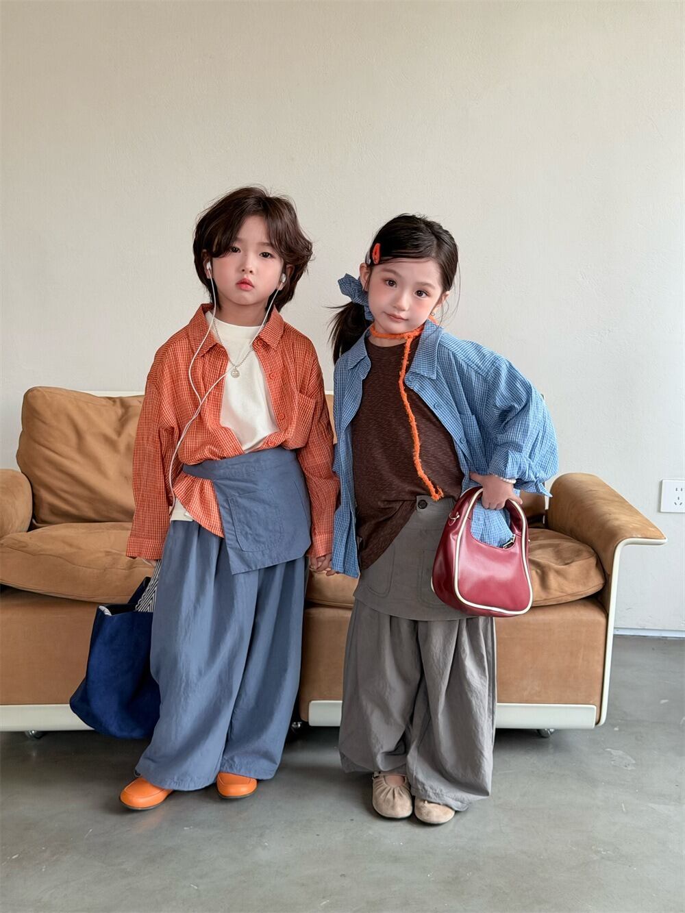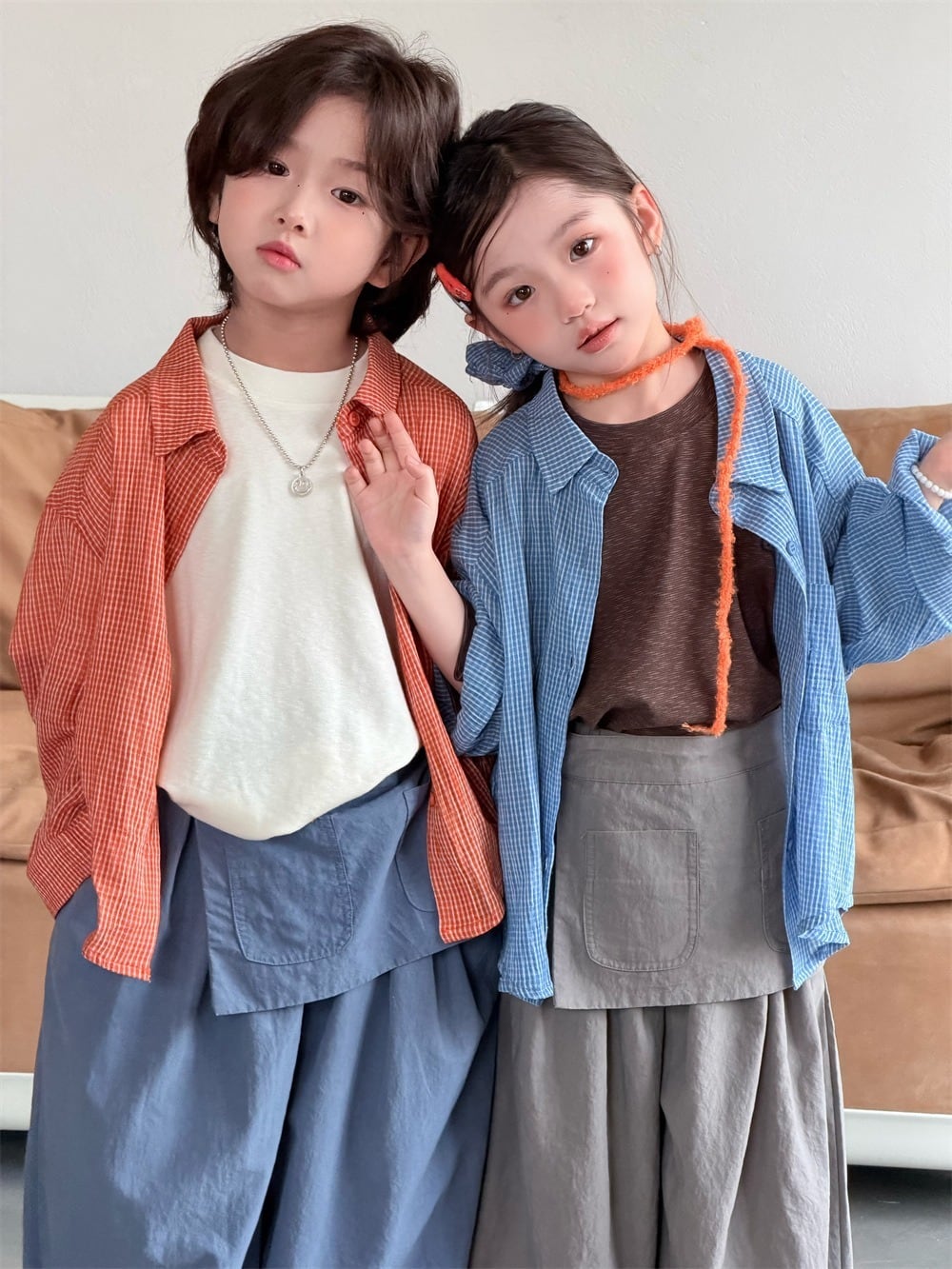 やわらかチェックシャツ(ブルー/オレンジ)XDJK 2026春|90-150cm|トップス|シャツ|羽織り [取寄]