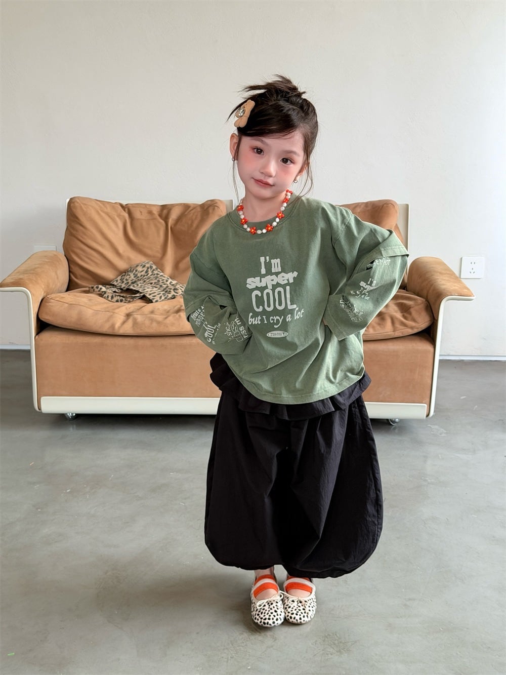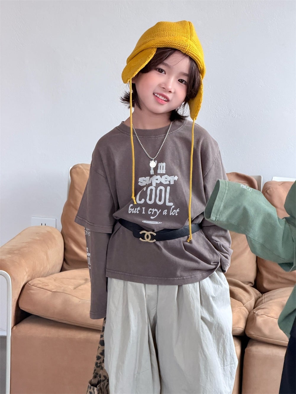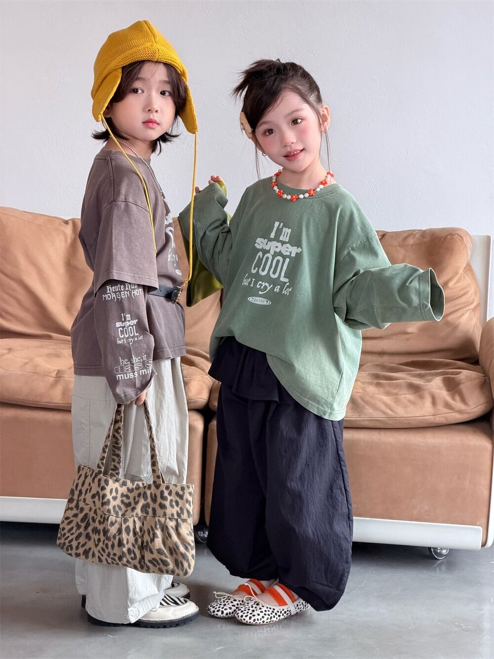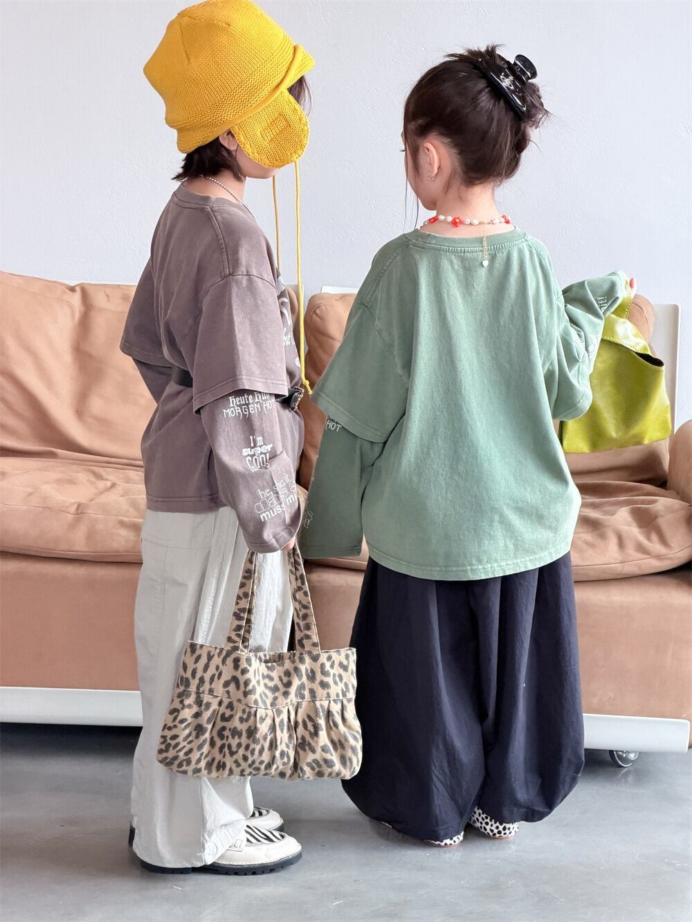 フェイクレイヤード袖プリントロングTシャツ(オリーブ/モカ)XDJK 2026春|90-150cm|トップス|ドッキングTシャツ|重ね着風 [取寄]