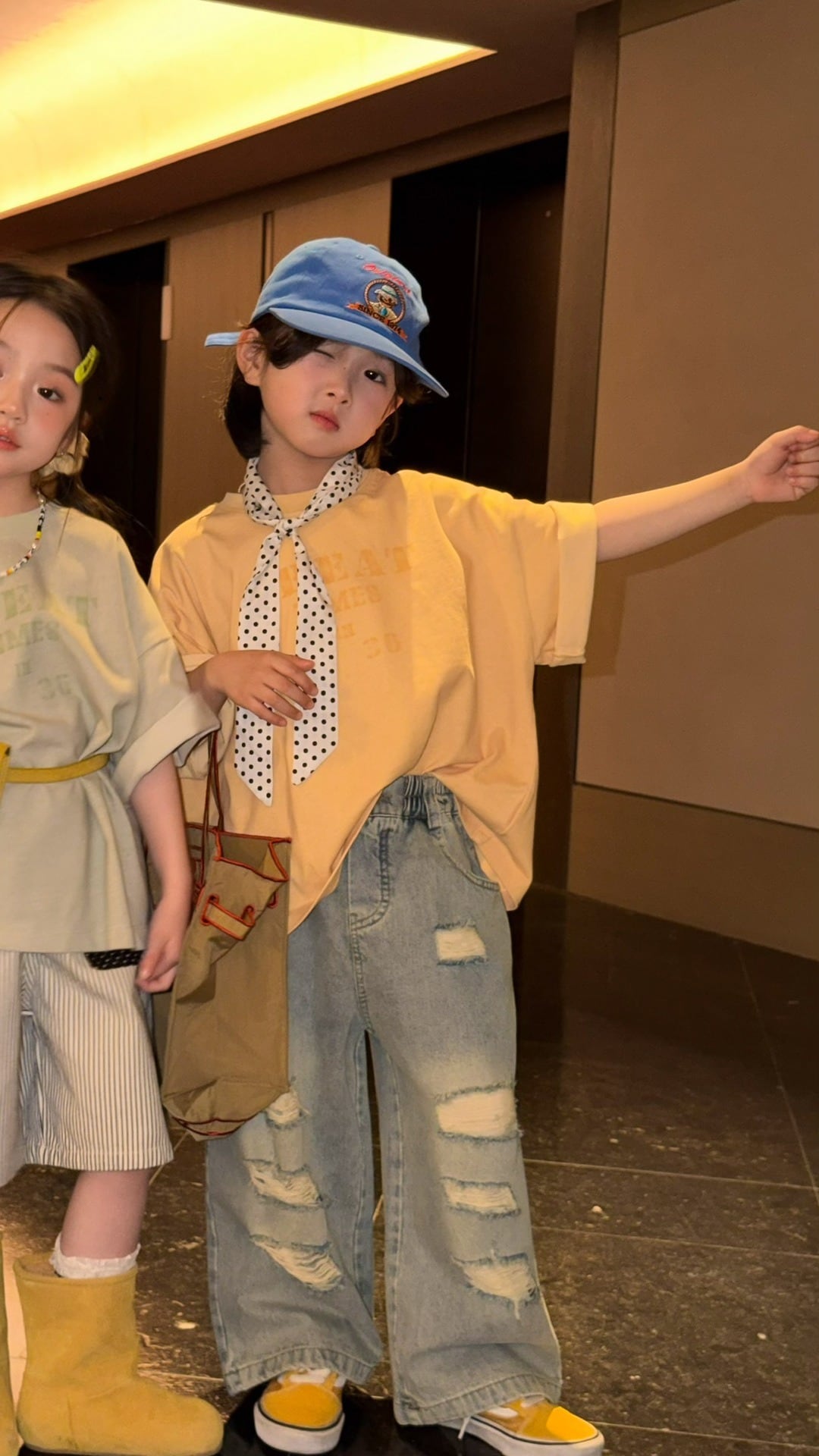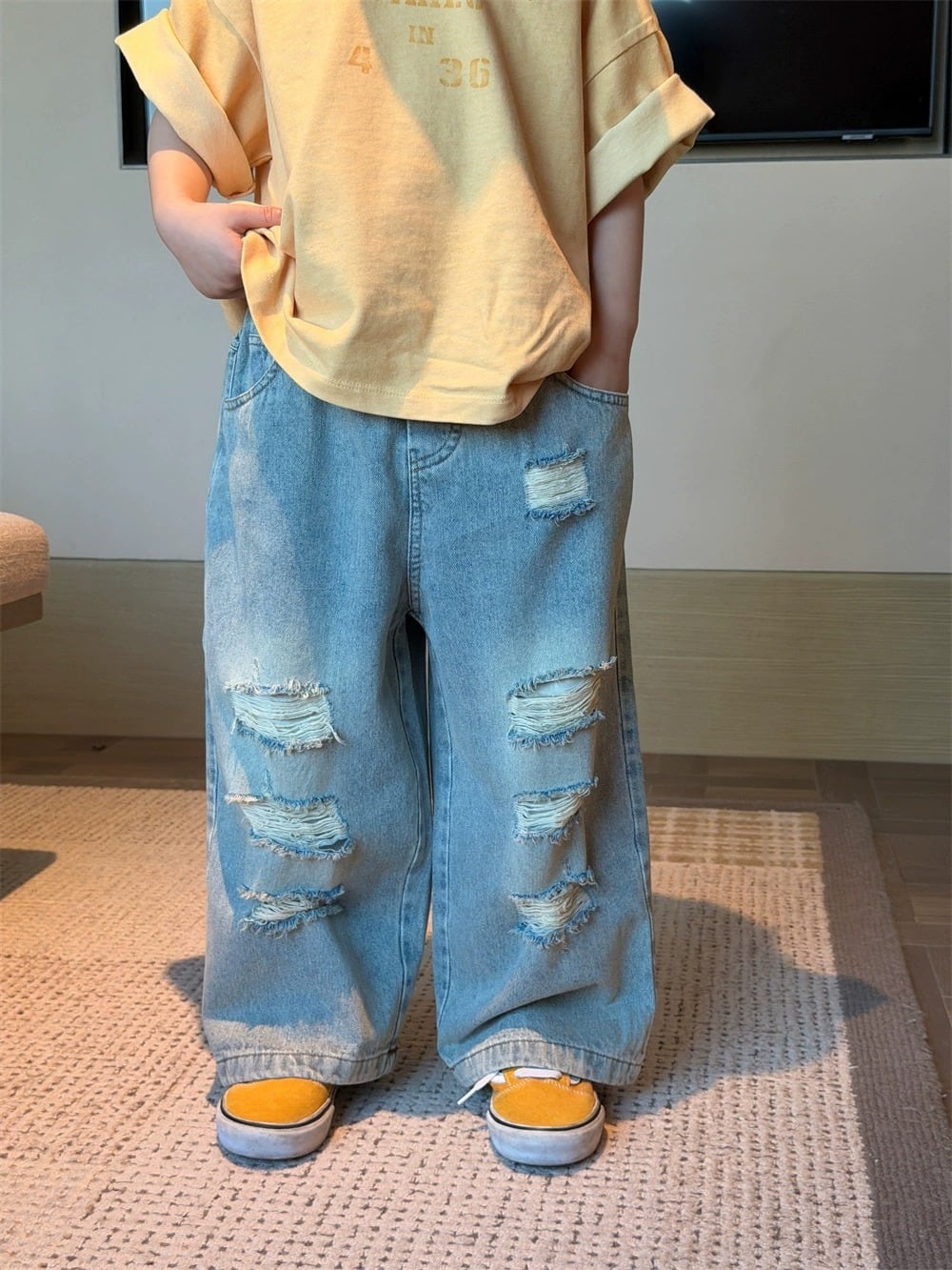 クラッシュデニムパンツ(ウォッシュブルー)XDJK 2026春|90-150cm|ボトムス|ジーンズ|ダメージデニム [取寄]