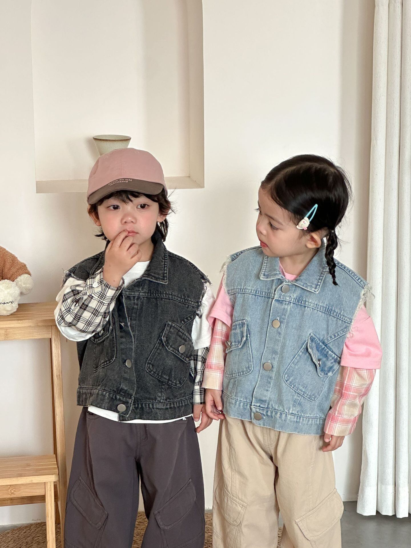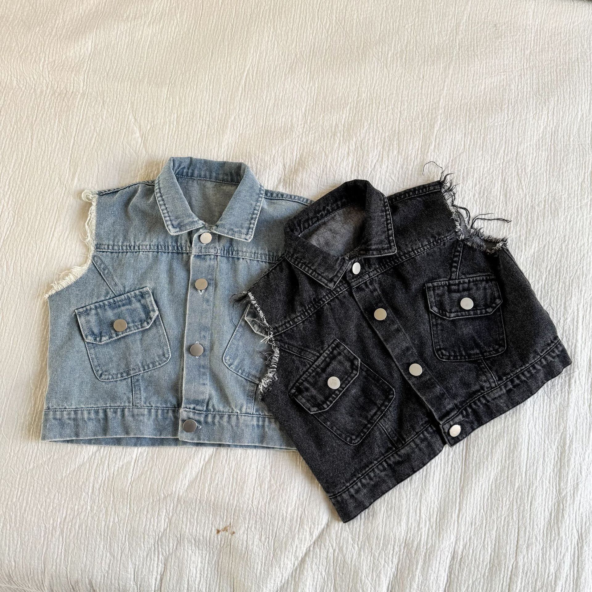 ダメージデニムベスト(ウォッシュブルー/ブラック)QQMM 2026春|80-150cm|アウター|クラッシュデニム|上着 [取寄]