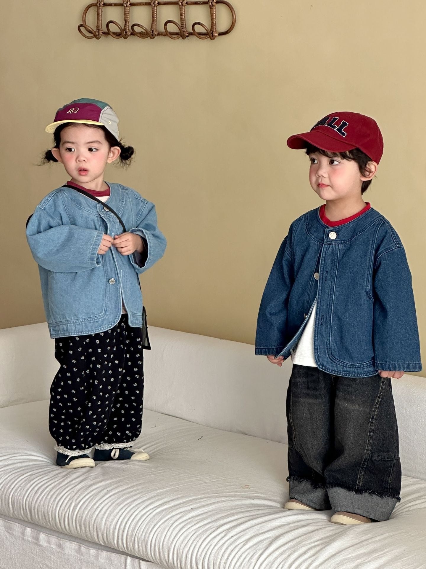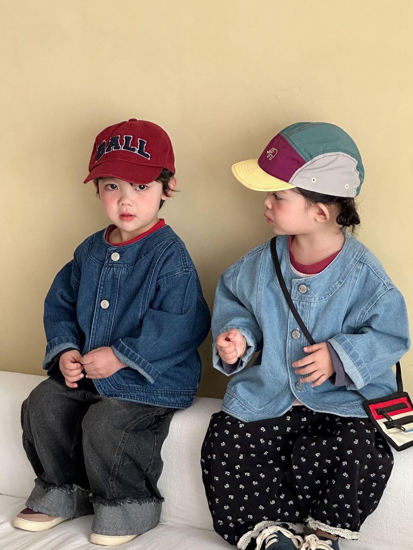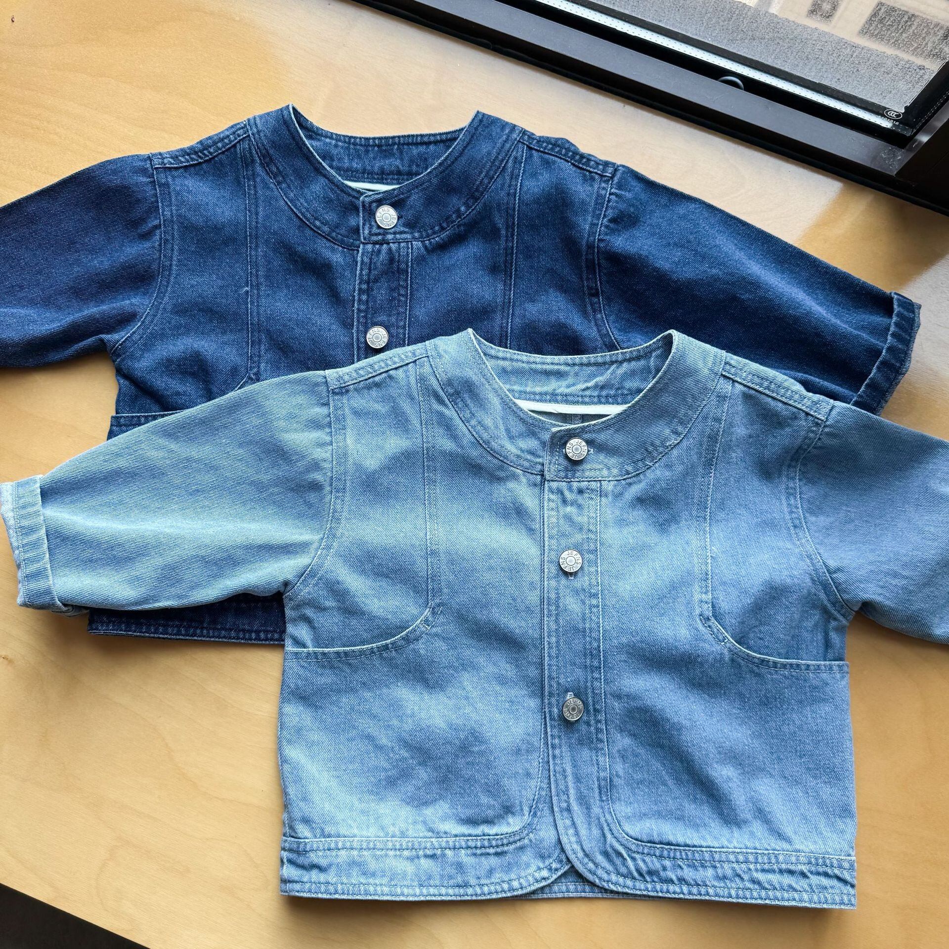 ノーカラーデニムジャケット(ウォッシュブルー/ブルー)QQMM 2026春|80-150cm|アウター|カーディガン|上着 [取寄]