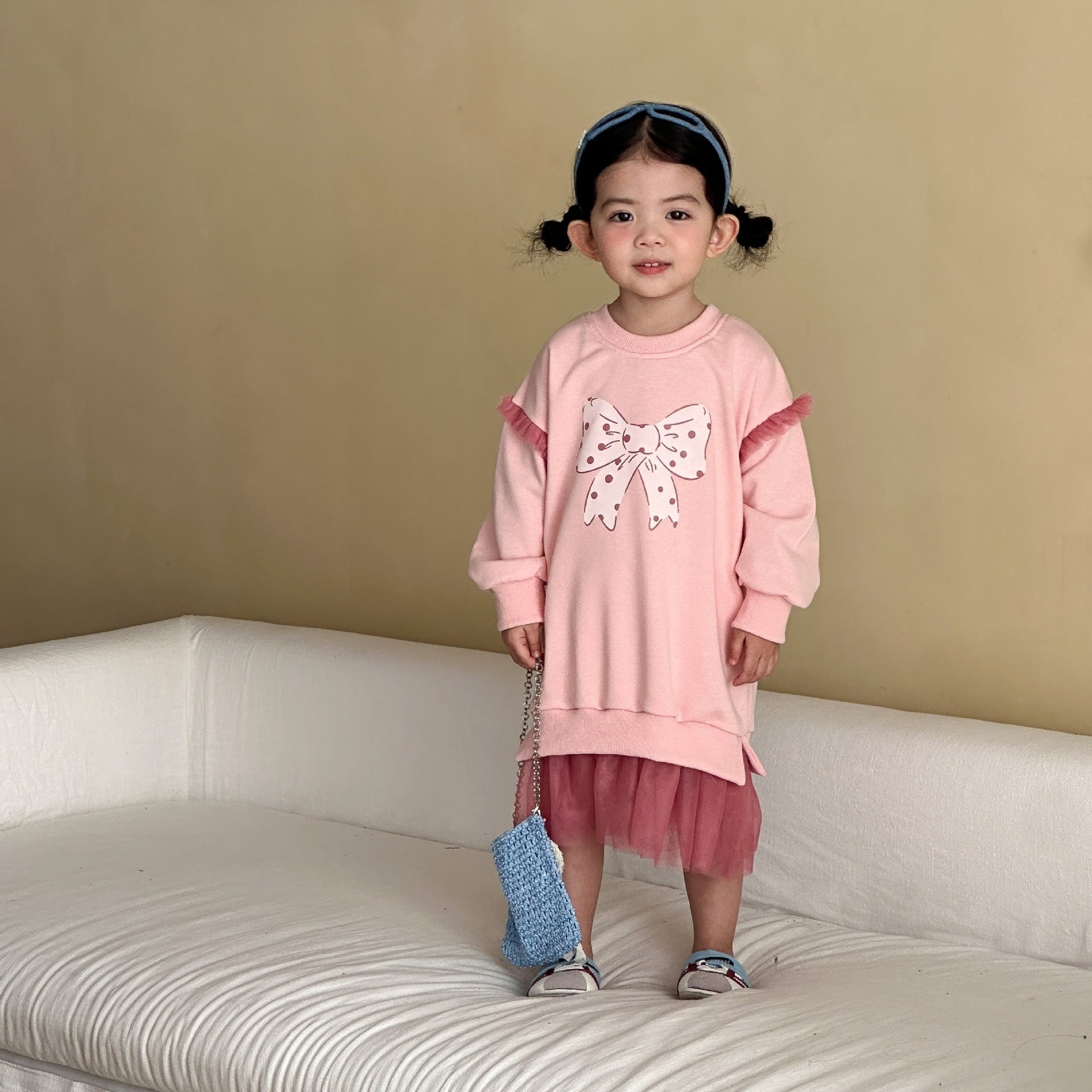 りぼんスウェットワンピース(ピンク)QQMM 2026春|80-150cm|ワンピース|レース|女の子 [取寄]