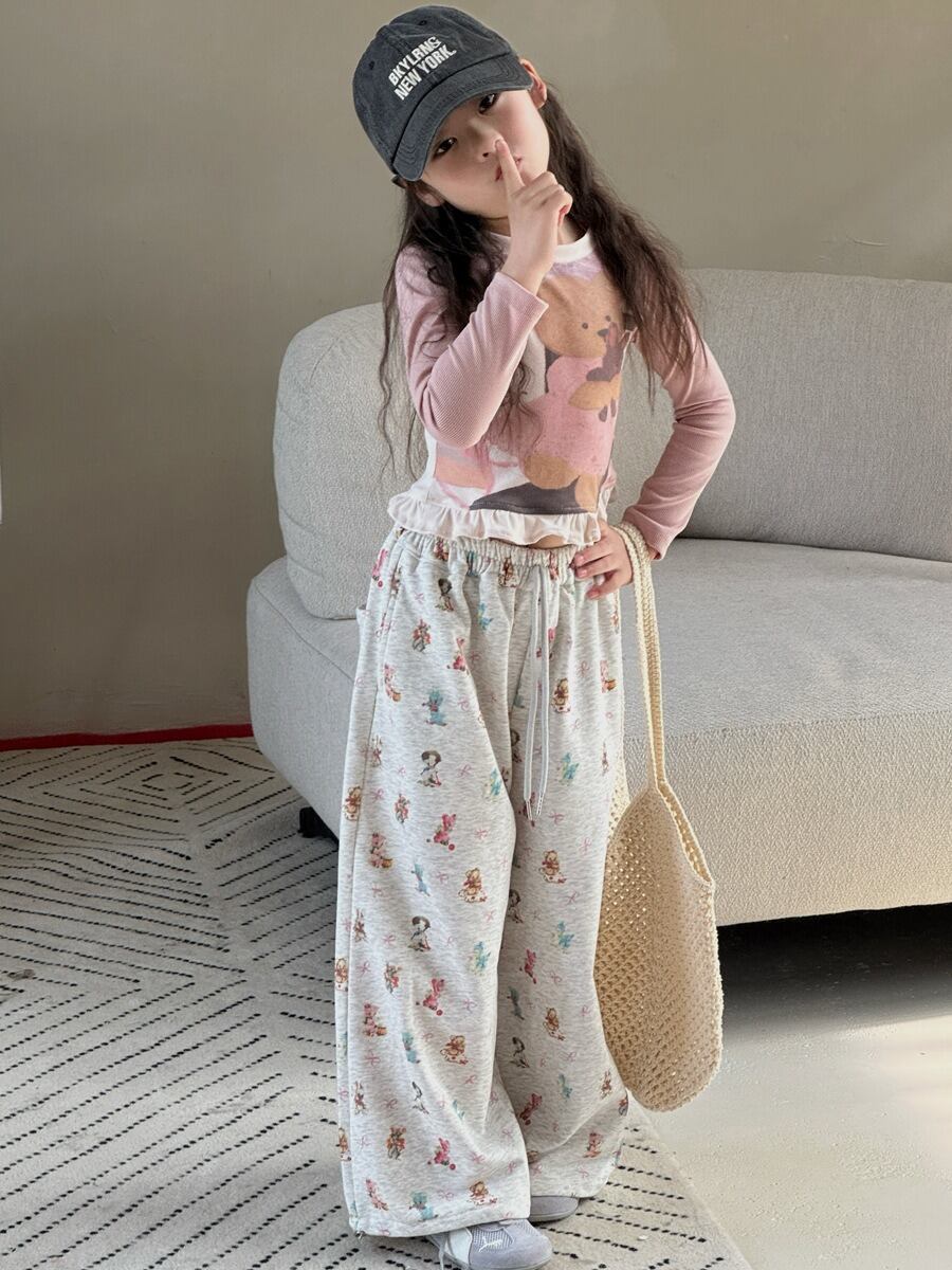 アニマル柄リボンスウェットパンツ(グレー)QBSH 2026春|100-150cm|イージーパンツ|ぬいぐるみ柄|ワイドパンツ [取寄]