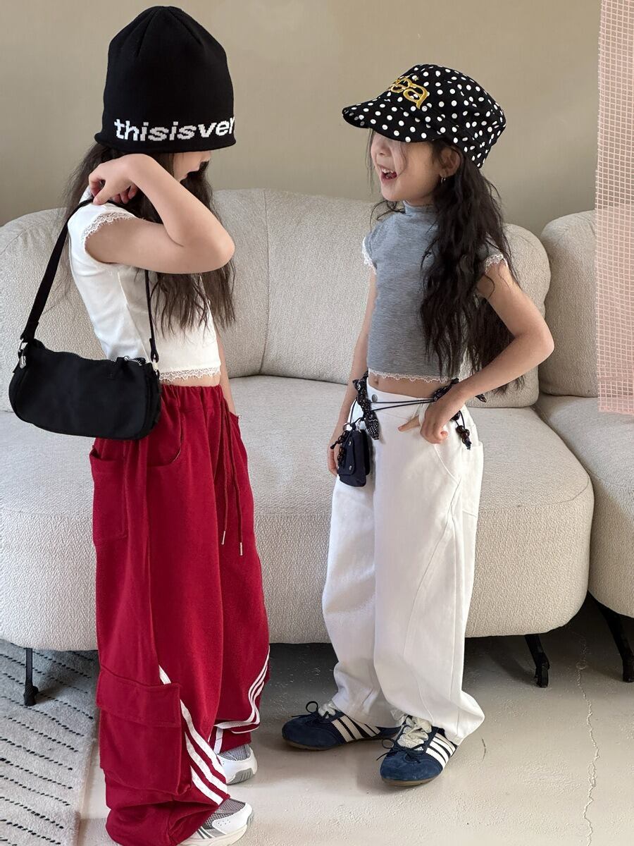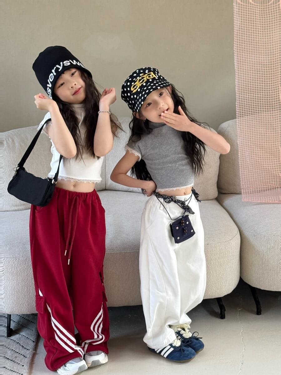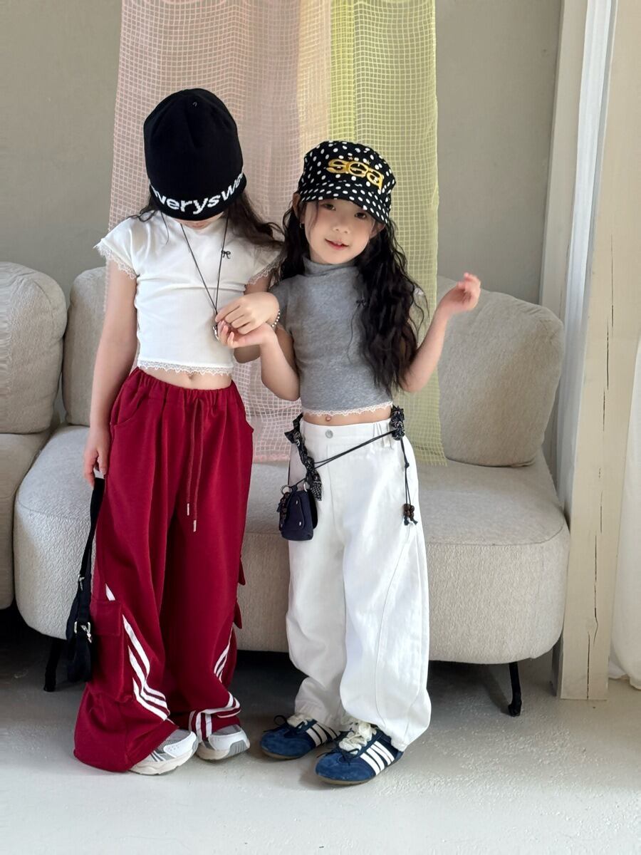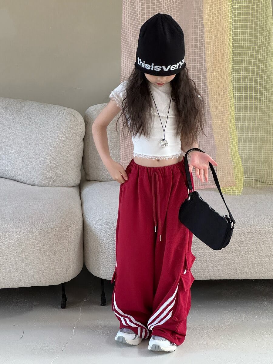 斜めラインワイドスウェットパンツ(ブラック/グレー/レッド)QBSH 2026春|100-150cm|カーゴパンツ|ワイドパンツ|イージーパンツ [取寄]