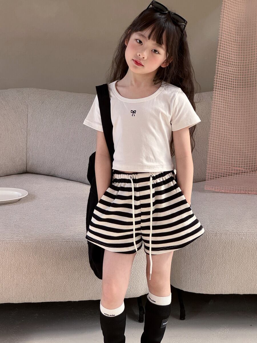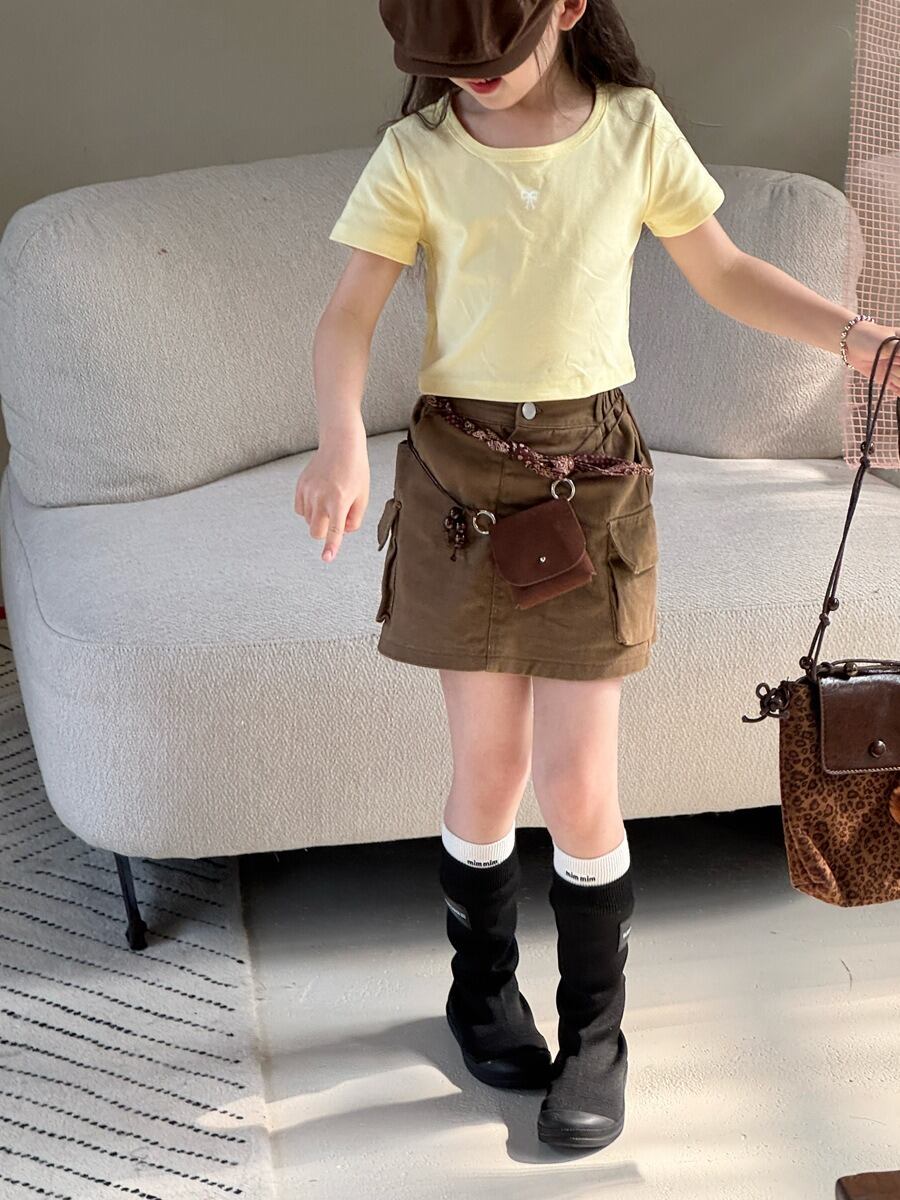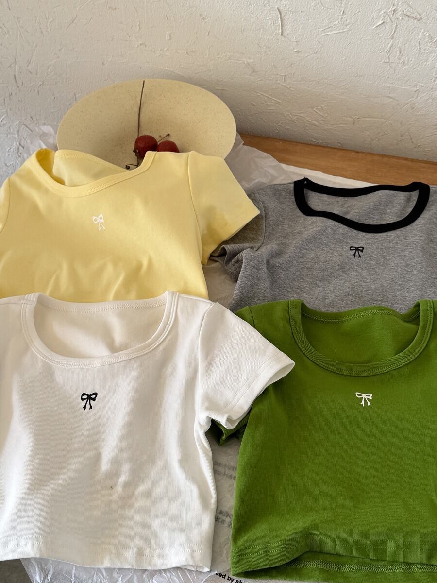 ショート丈リボンTシャツ(ホワイト/グリーン/レモン/グレー)QBSH 2026春|100-150cm|トップス |リボン|ミニ丈 [取寄]