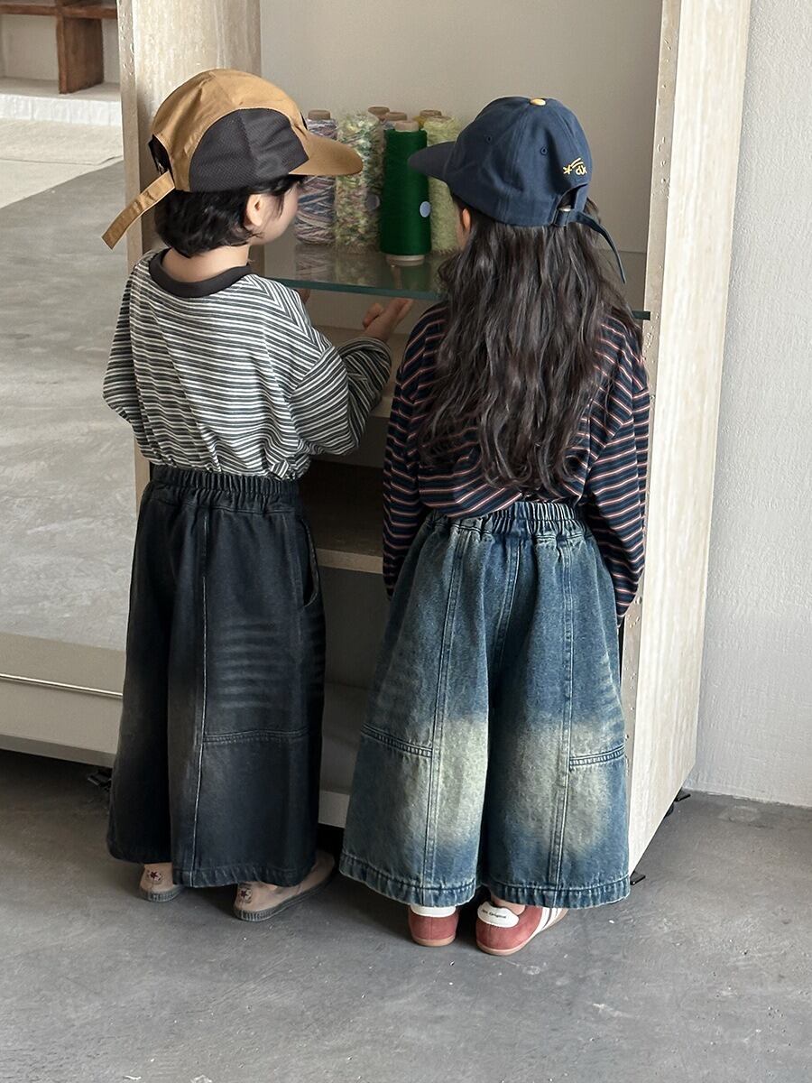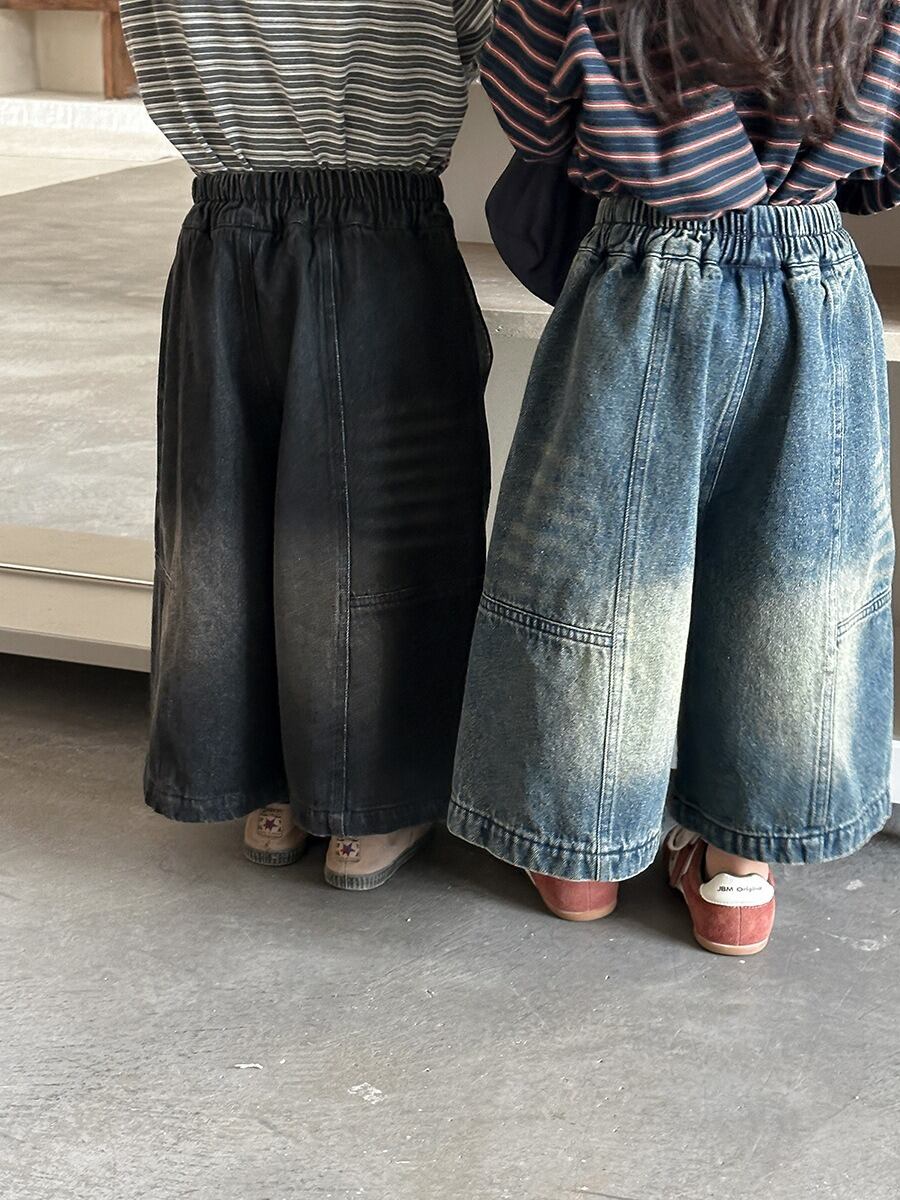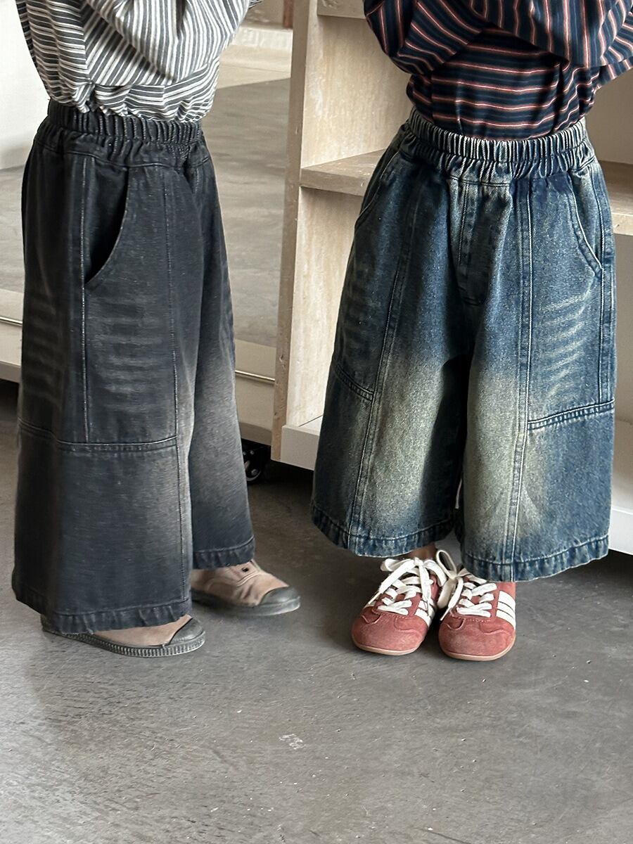 色落ちデニムオーバーワイドパンツ(ブルー/ブラック)JIAY 2026春|80-140cm|ボトムス|クロップド丈|ジーンズ[取寄]