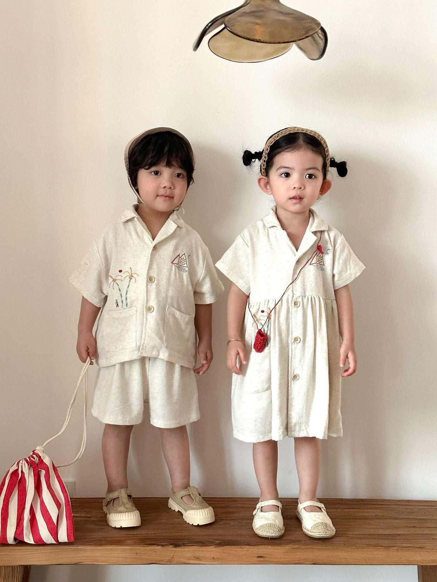 リネン混サマー刺繡セットアップとワンピース(アイボリー)QQMM 2026夏|80-150cm|上下セット|リンクコーデ|子供服|韓国子供服|男の子|女の子 [取寄]