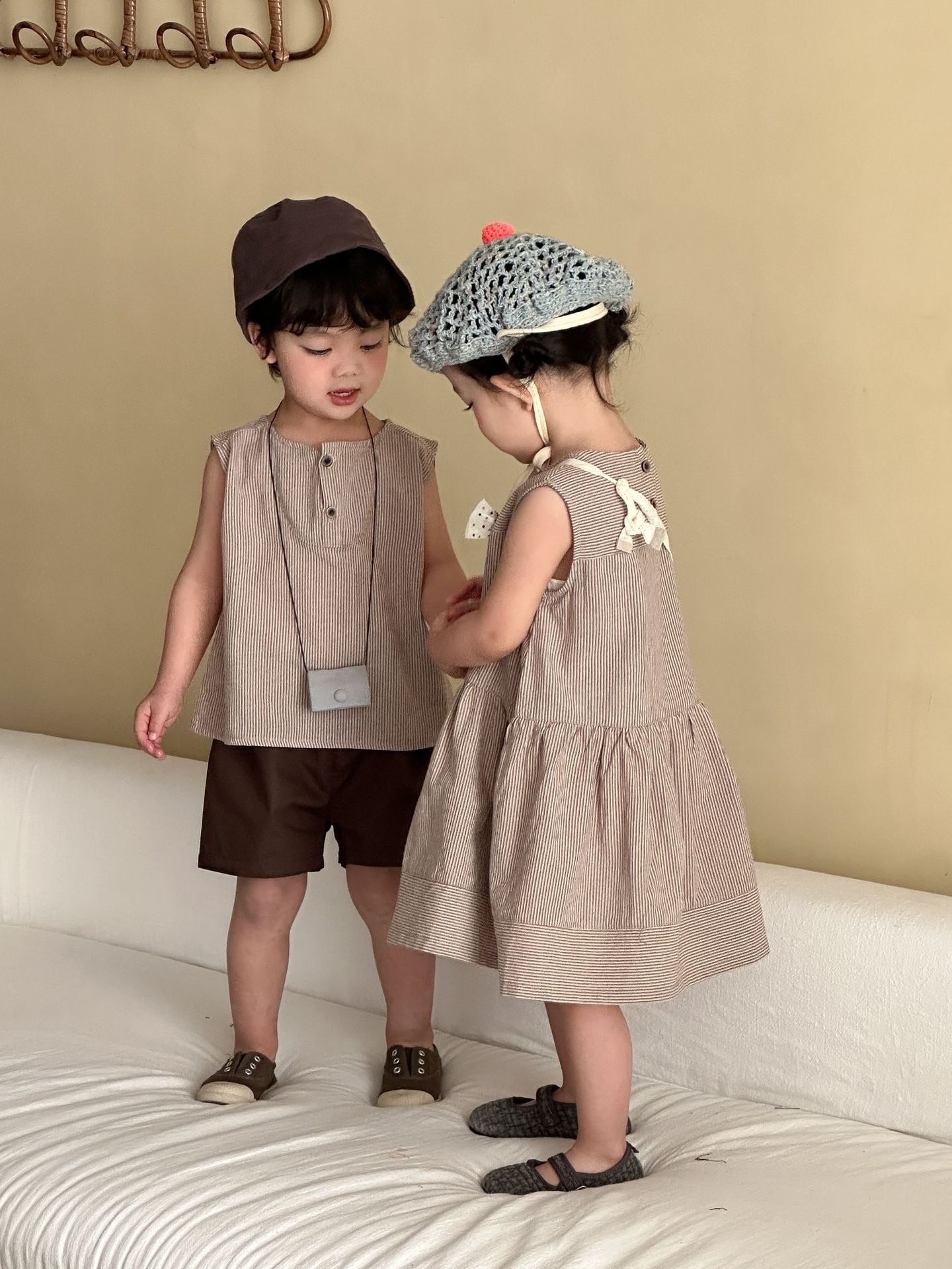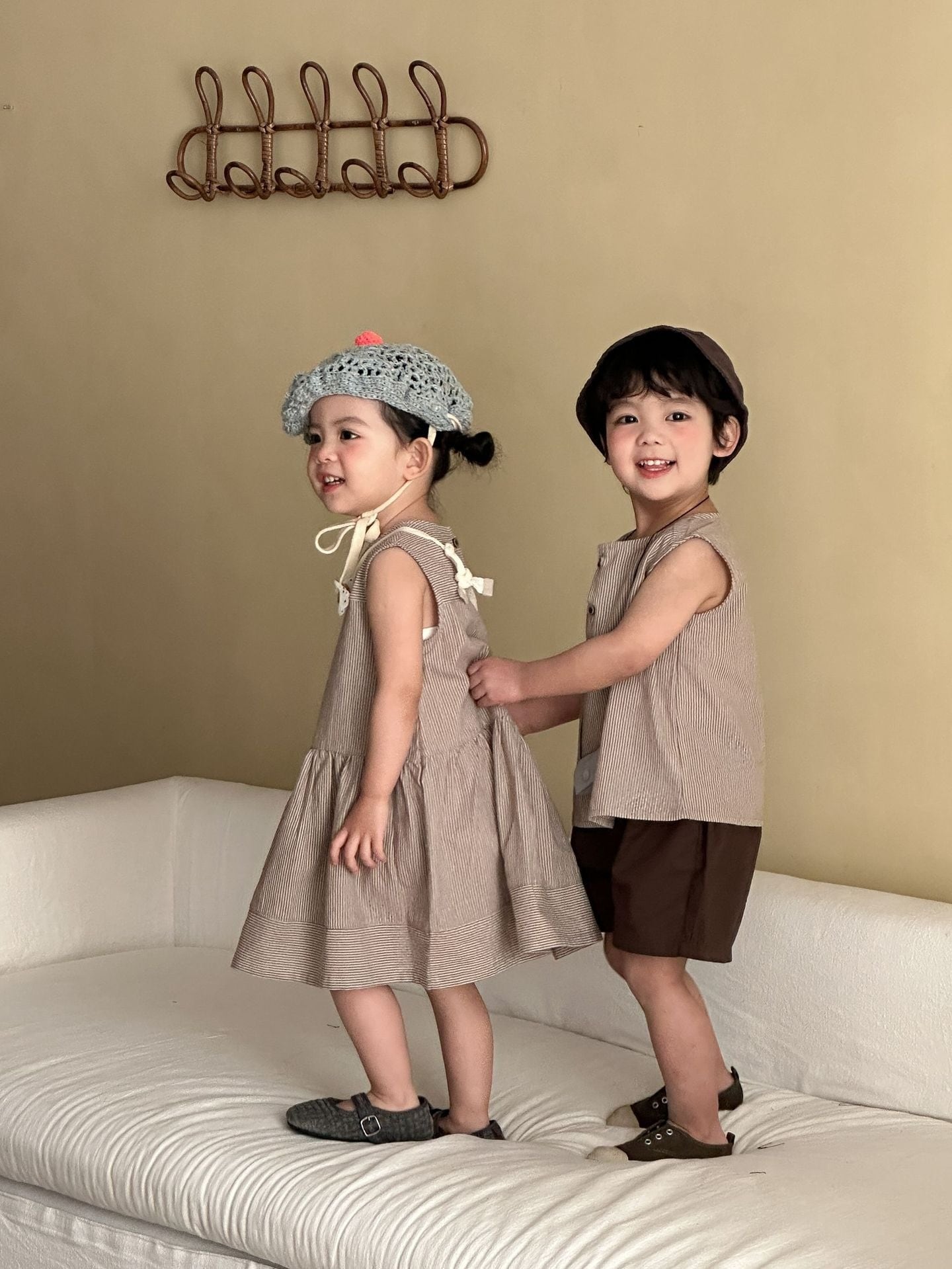 細ピッチボーダーノースリーブセットアップとワンピース(モカ)QQMM 2026夏|80-150cm|ノースリーブ|リンクコーデ|子供服|韓国子供服|女の子|男の子 [取寄]