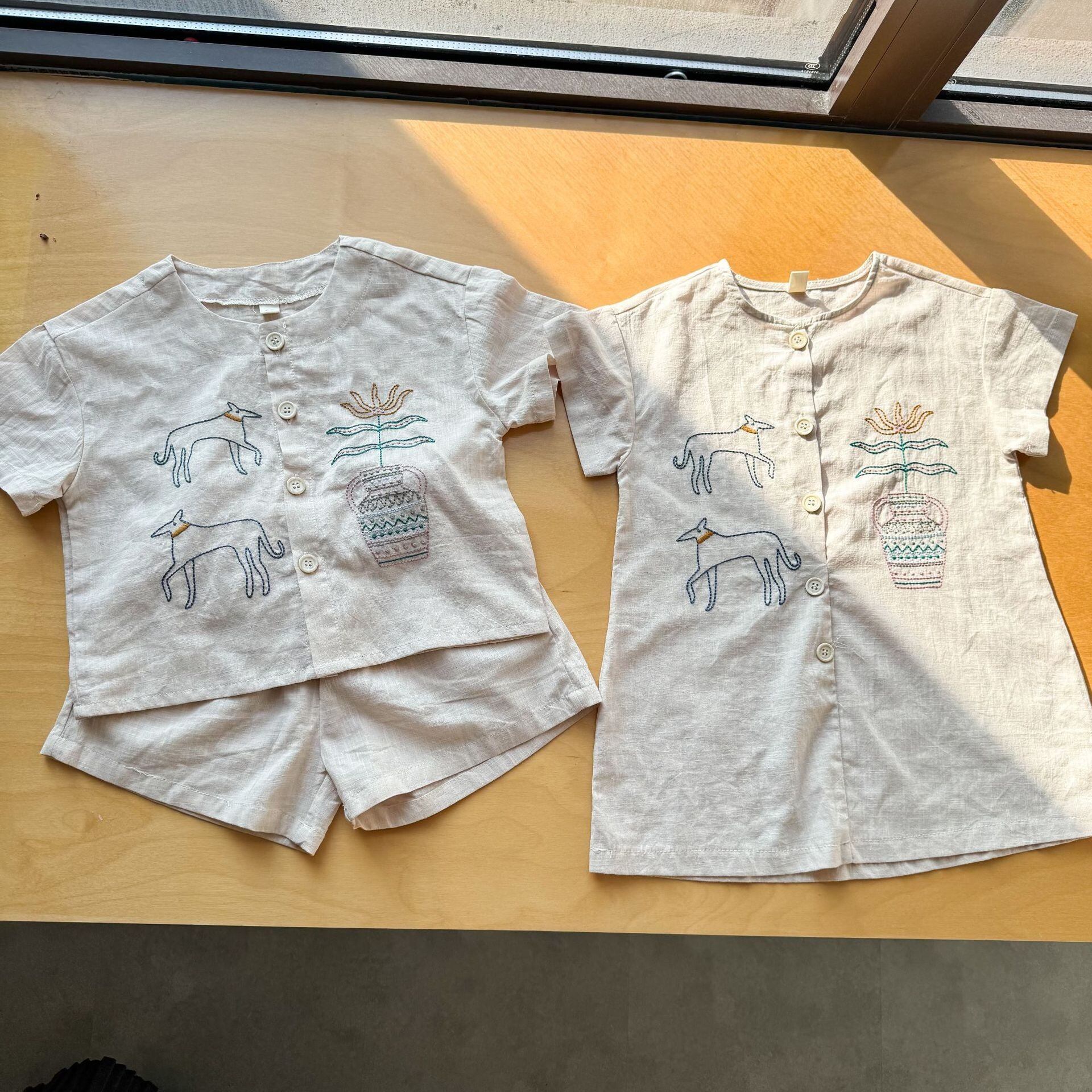 リネン混アラビア風刺繡セットアップとワンピース(アイボリー)QQMM 2026夏|80-150cm|上下セット|リンクコーデ|子供服|韓国子供服|女の子|男の子 [取寄]