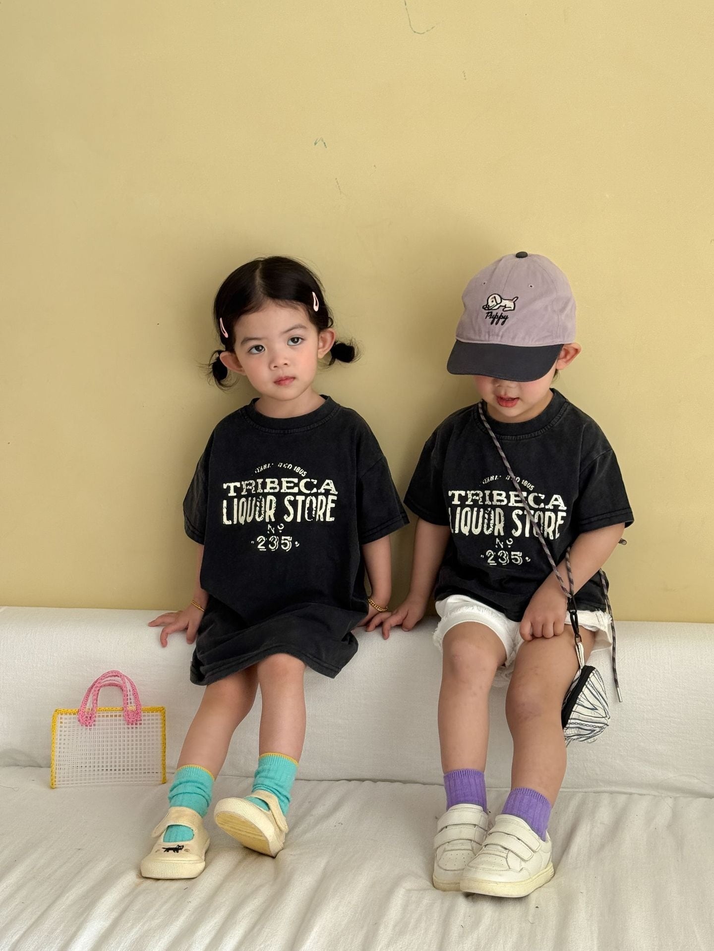 ウォッシュ加工Tシャツとワンピース(ブラック)QQMM 2026夏|80-150cm|ロゴT|リンクコーデ|子供服|韓国子供服|女の子|男の子 [取寄]