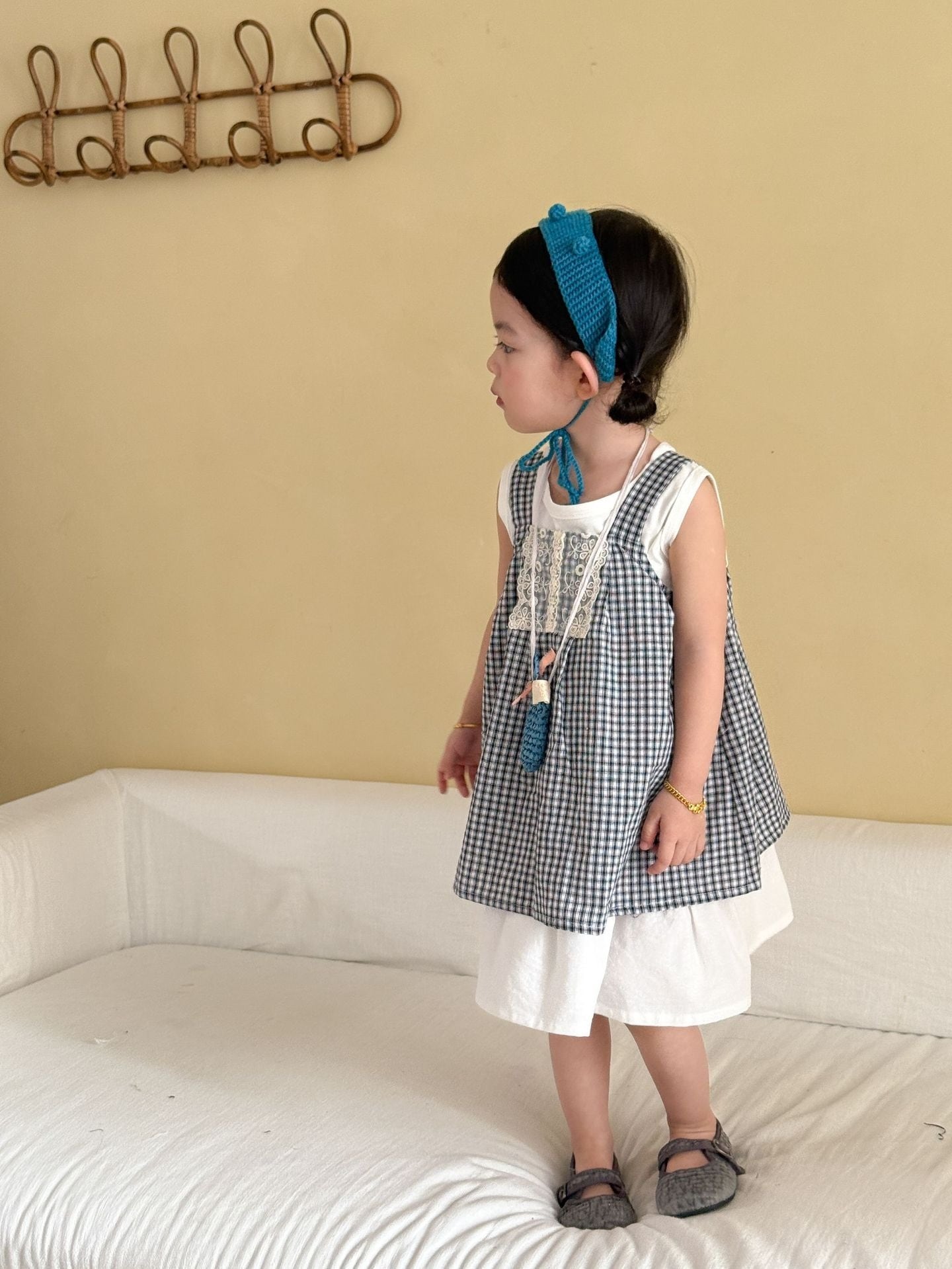 ギンガムチェックシャツセットアップとレイヤードワンピース(白黒)QQMM 2026夏|80-150cm|上下セット|リンクコーデ|子供服|韓国子供服|女の子|男の子 [取寄]