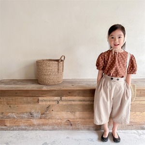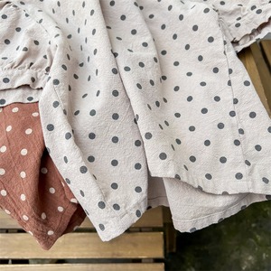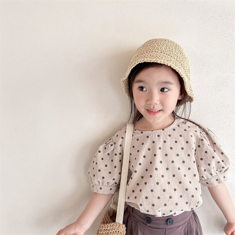 《取寄》 コットンリネンのドットトップス(全2色) ADBB 韓国子供服トップス カットソー Tシャツ 半袖 パフスリーブ 水玉 (80~130cm)