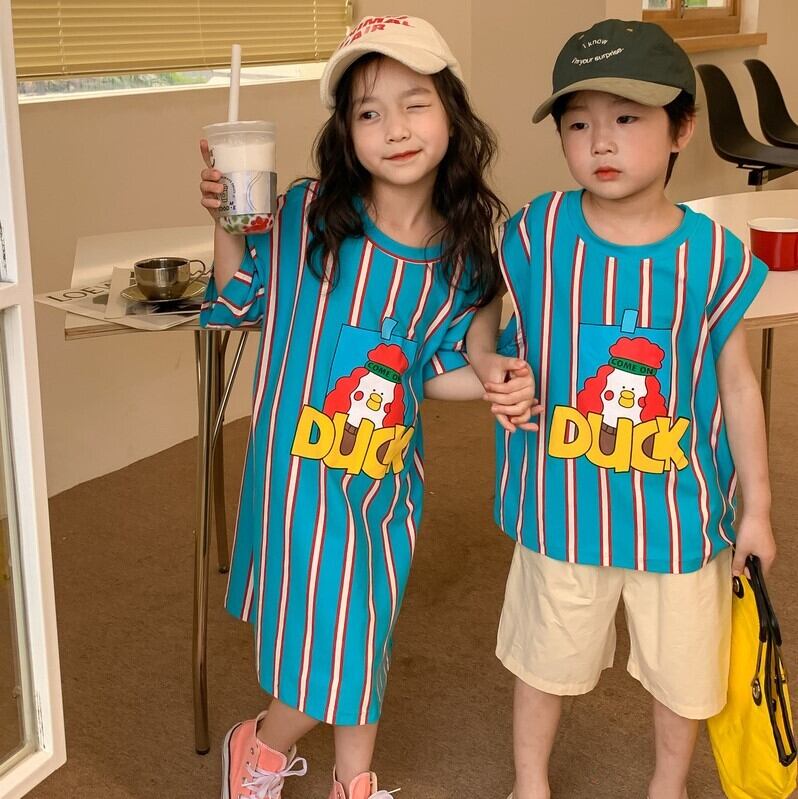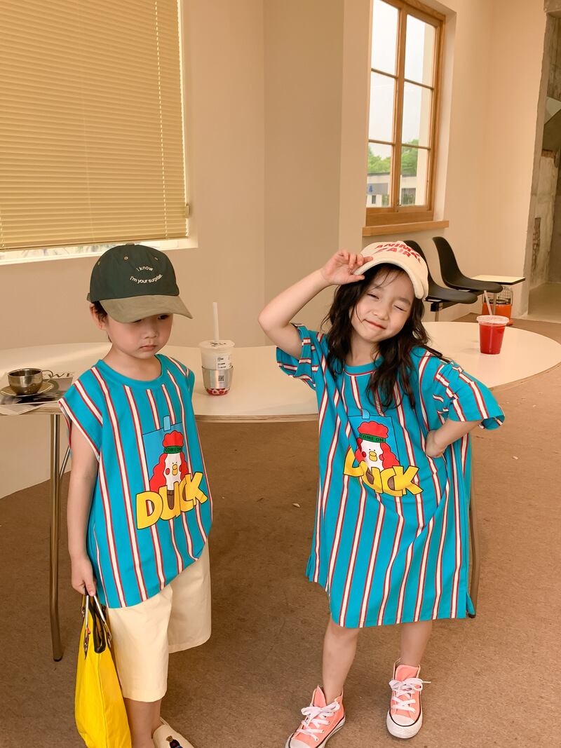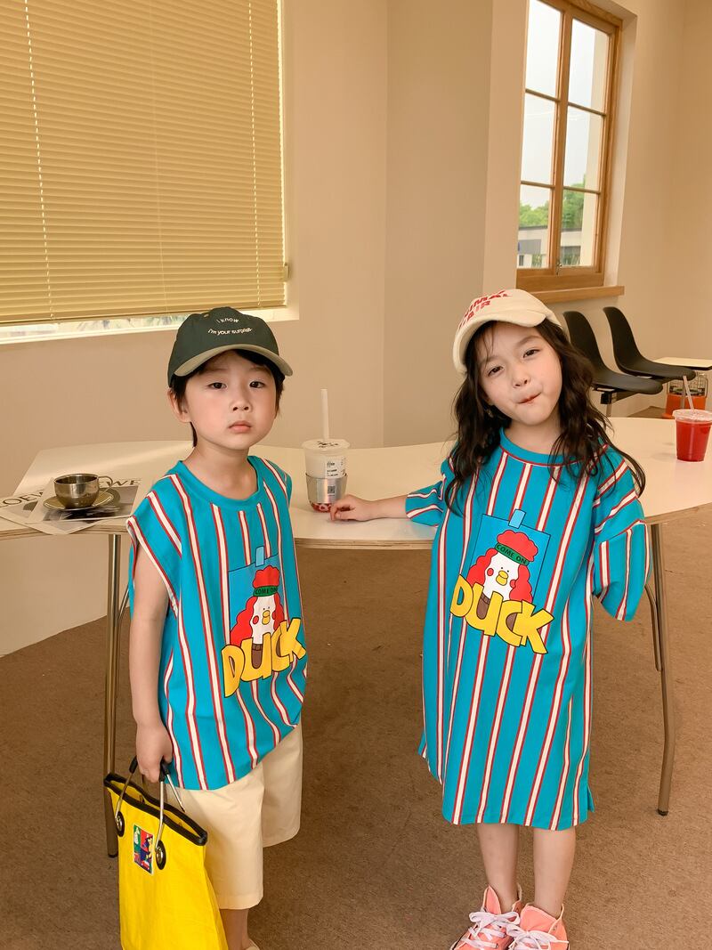 《取寄》 DUCKストライプワンピース&Tシャツ KMAI 韓国子供服 ノースリーブ Tシャツワンピ ストライプ アメカジ レトロ リンクコーデ