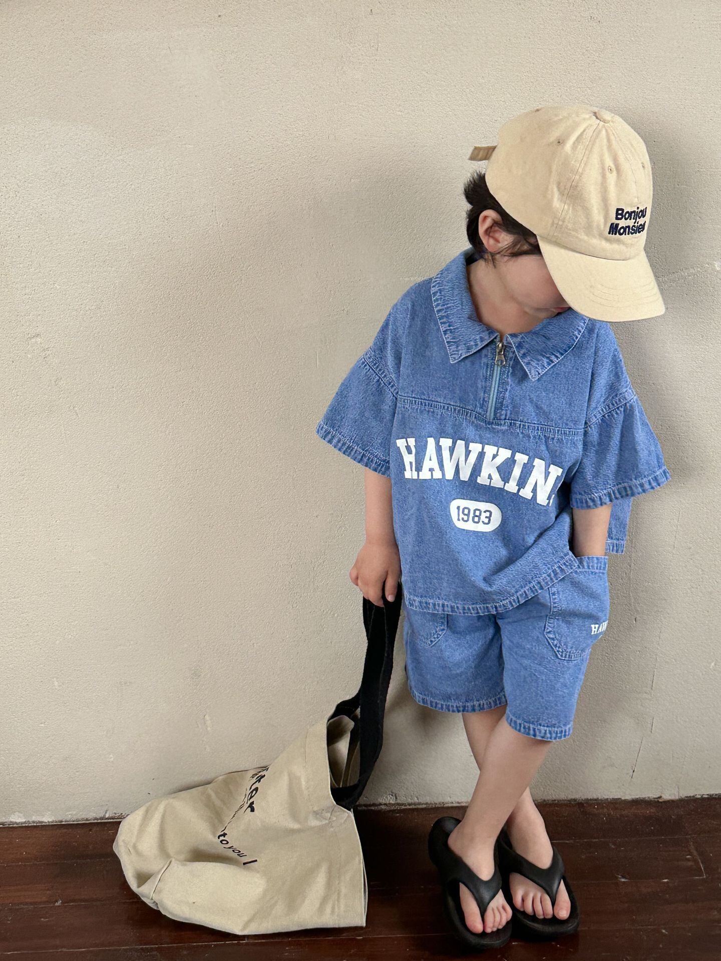 《取寄》 プリントデニムセットアップ QQMM 韓国子供服 男の子 セットアップ 上下セット デニム ロゴ ハーフパンツ polo (80~150cm)