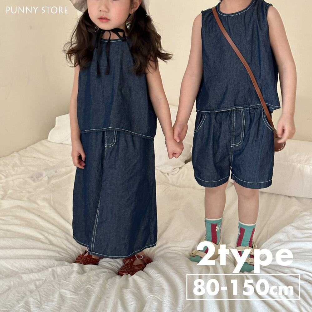 《取寄》サマーデニムノースリーブセットアップ (全2種) QQMM 2024夏 韓国子供服 薄手デニム シンプル 短パン ロングスカート リンクコーデ