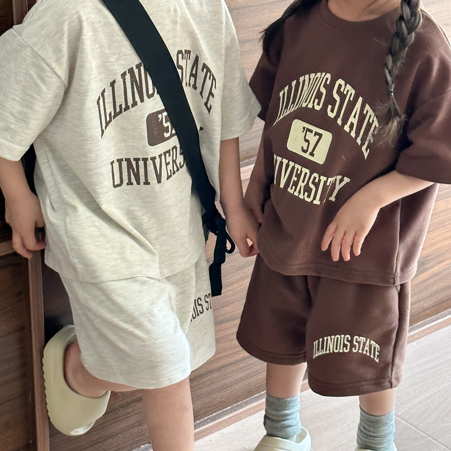 《取寄》スポカジロゴセットアップ (全2色) QQMM 2024夏 韓国子供服 アメカジ スポーツ レタリング ロゴ 半袖 上下セット リンクコーデ