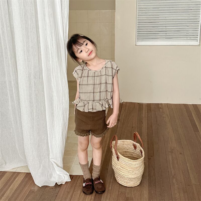 《取寄》 チェック柄フリルトップス (全2色) ADBB 2024夏 韓国子供服 ノースリーブ ギンガムチェック フリル 女の子