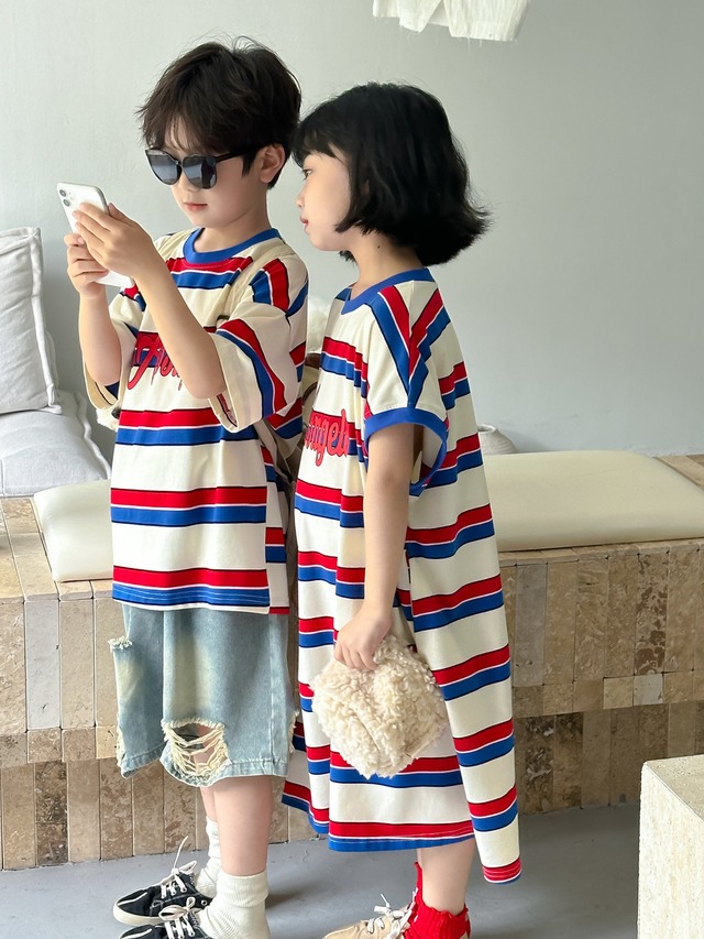 ・レトロボーダーロゴワンピース KMAI 2024夏 韓国子供服 総柄 Tシャツワンピース ボーダー アメカジ スカート リンクコーデ 女の子 《取寄》