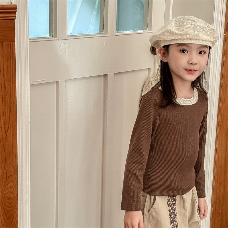 《取寄》 レーススクエアネックリブトップス (ピスタチオ/ブラウン/グレー) ADBB 2024秋 韓国子供服 ニット プルオーバー セーター アメカジ (80~130cm)