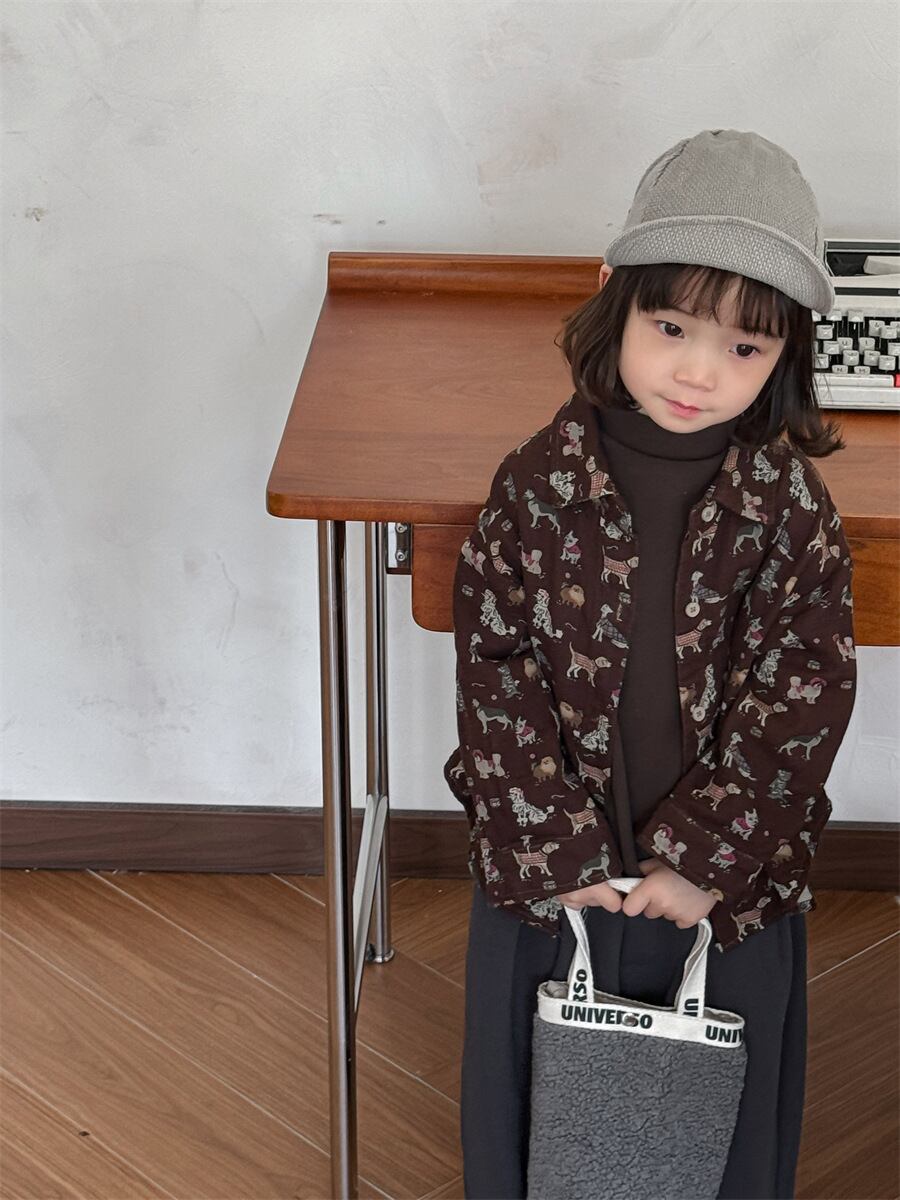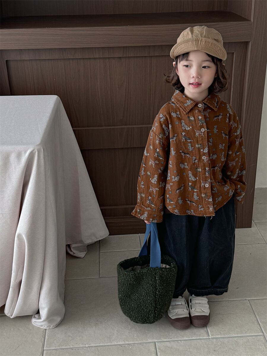 《取寄》 ワンちゃん柄ゆるカジシャツ (ブラック/ブラウン/キャメル) JIAY 2024秋 韓国子供服 シャツ 羽織り アウター 犬 Dog 総柄 シャツジャケット (80~140cm)