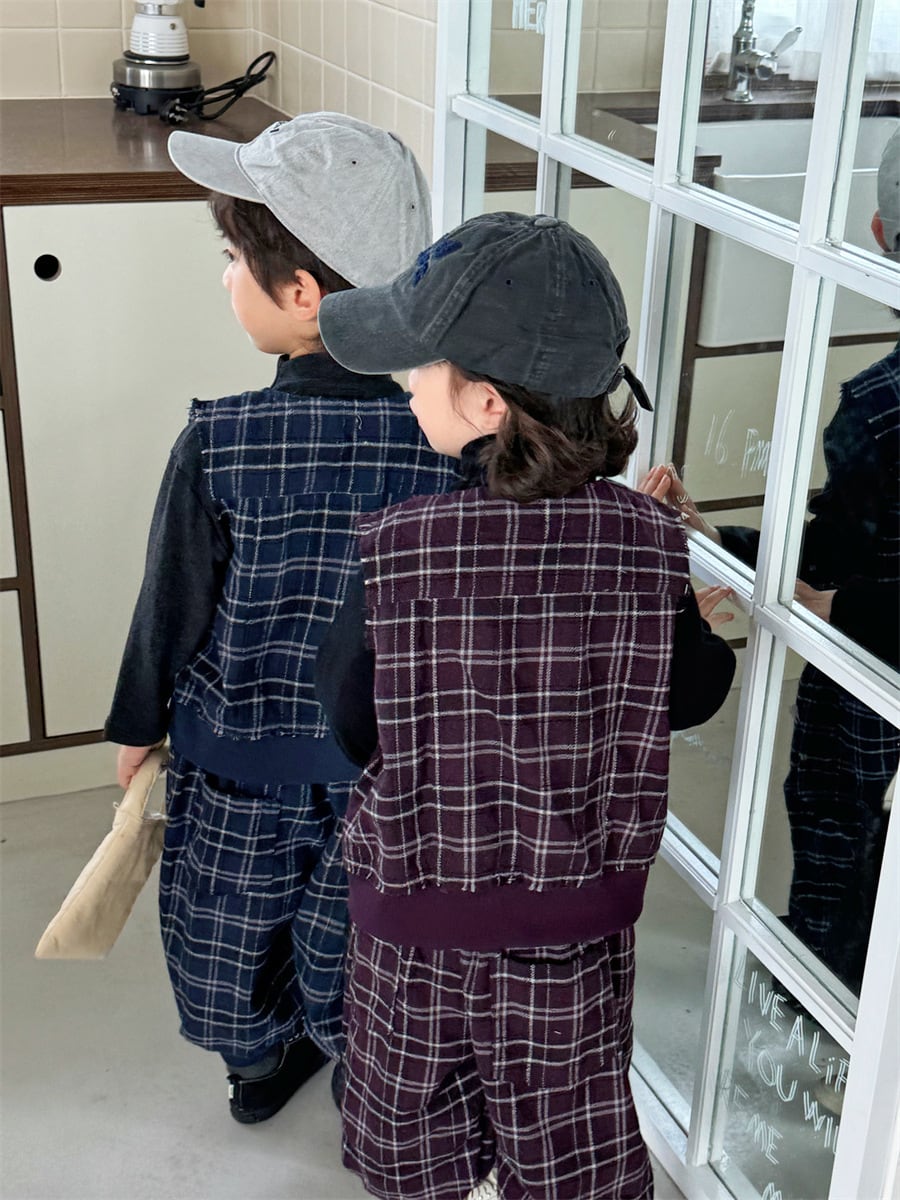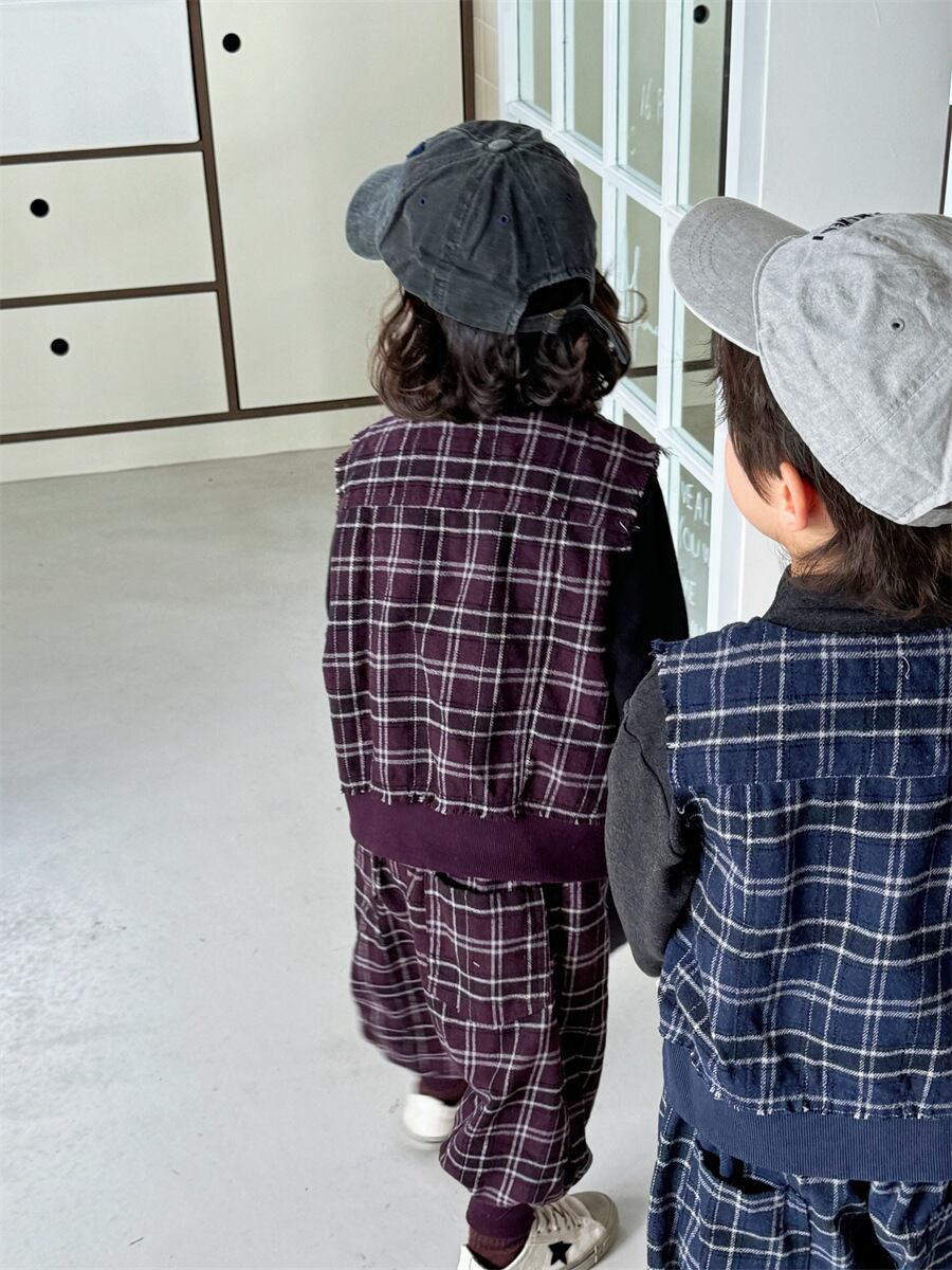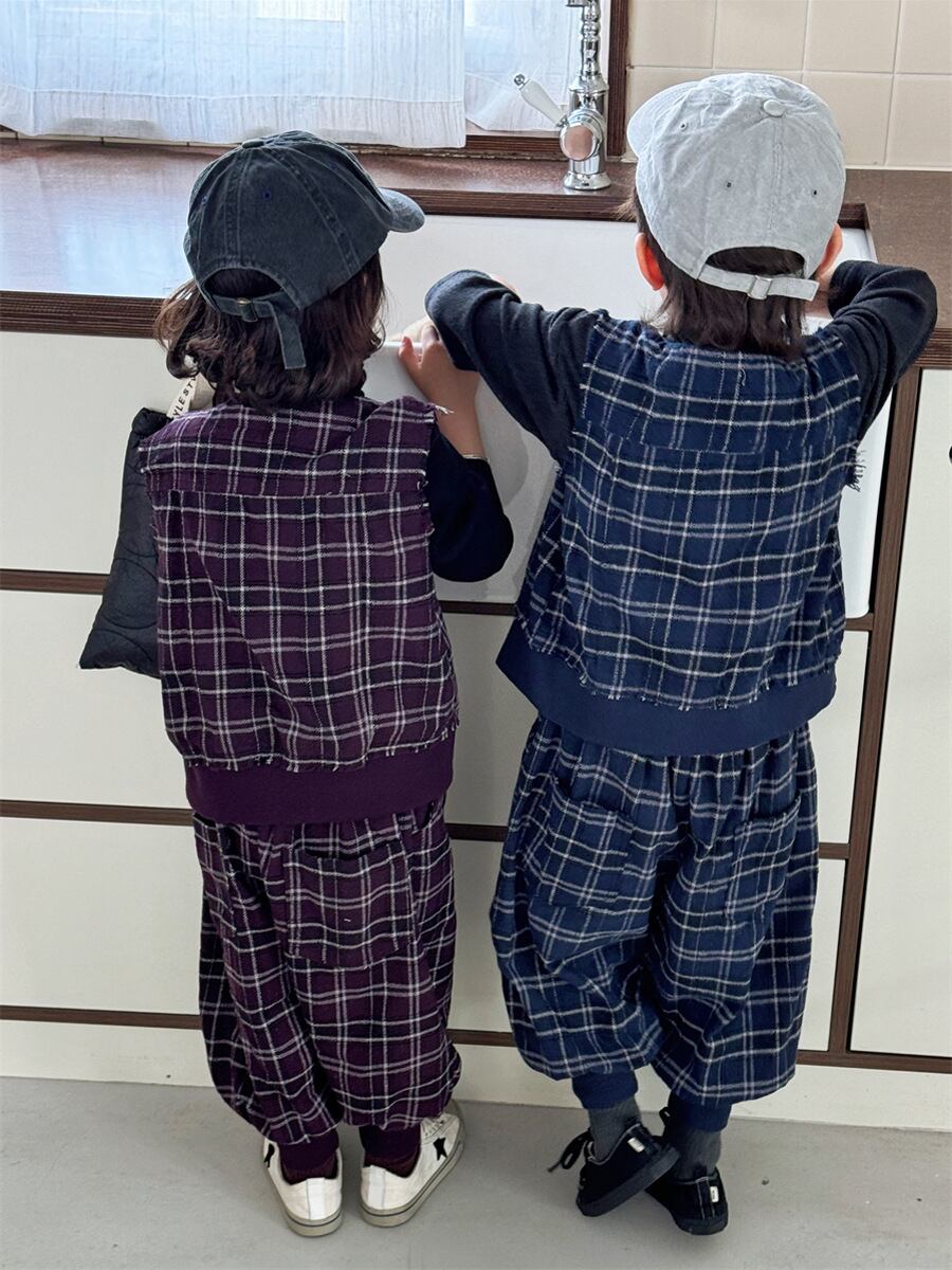 ・チェック柄ベストとパンツのセットアップ (ブルー/パープル) JIAY 2024秋 韓国子供服 上下セット ベスト サルエルパンツ 重ね着 リンクコーデ (80~140cm)《取寄》