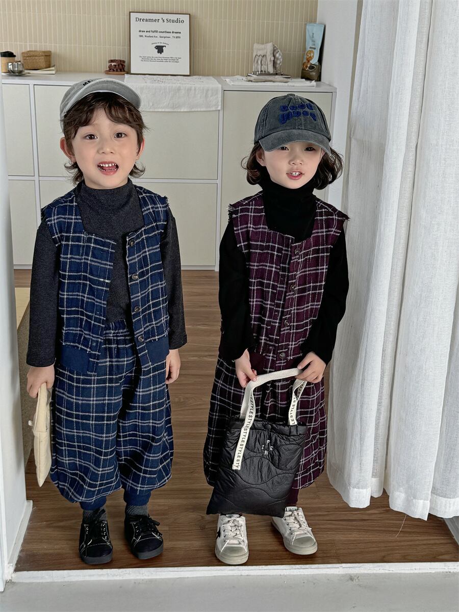 《取寄》 チェック柄ベストとパンツのセットアップ (ブルー/パープル) JIAY 2024秋 韓国子供服 上下セット ベスト サルエルパンツ 重ね着 リンクコーデ (80~140cm)