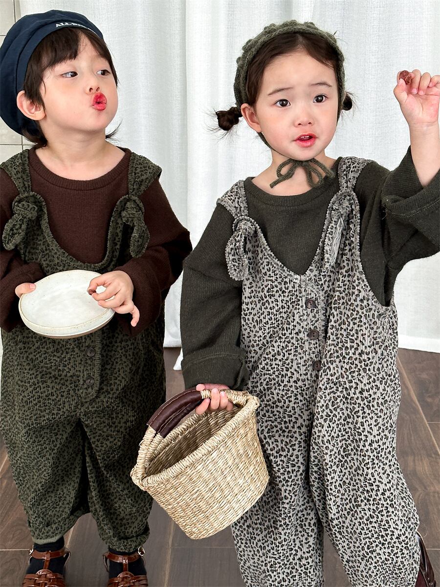 ・ヒョウ柄コーデュロイサロペット (ライトグレー/カーキ) JIAY 2024秋 韓国子供服 アニマル柄 豹柄 オーバーオール オールインワン (80~140cm) 《取寄》