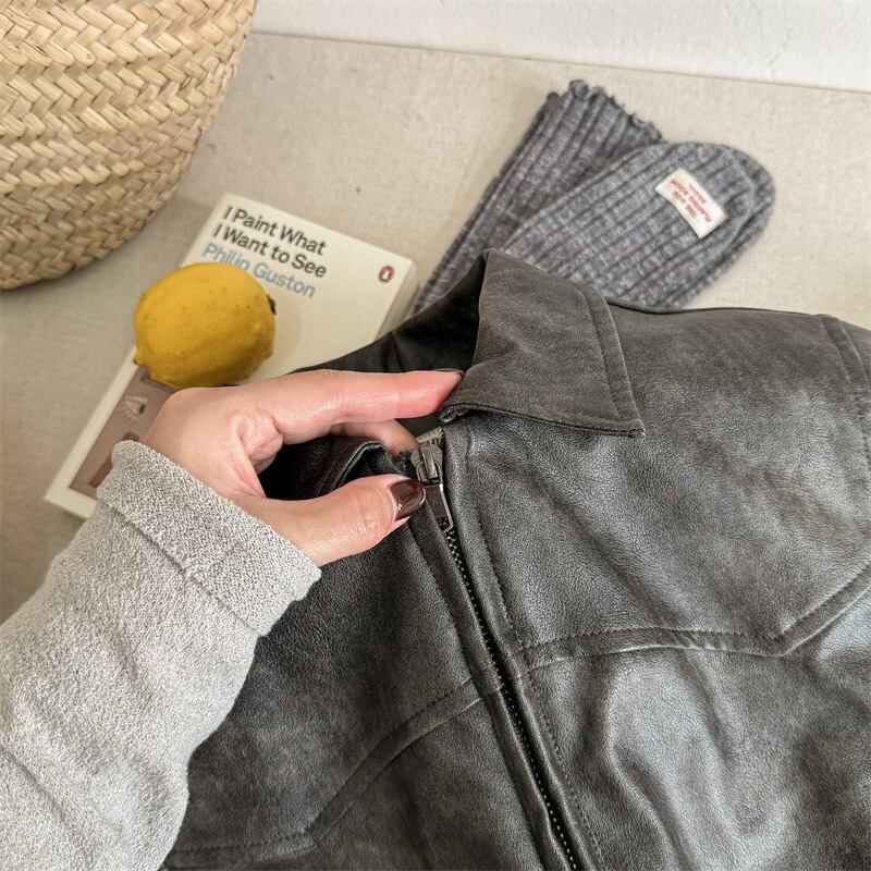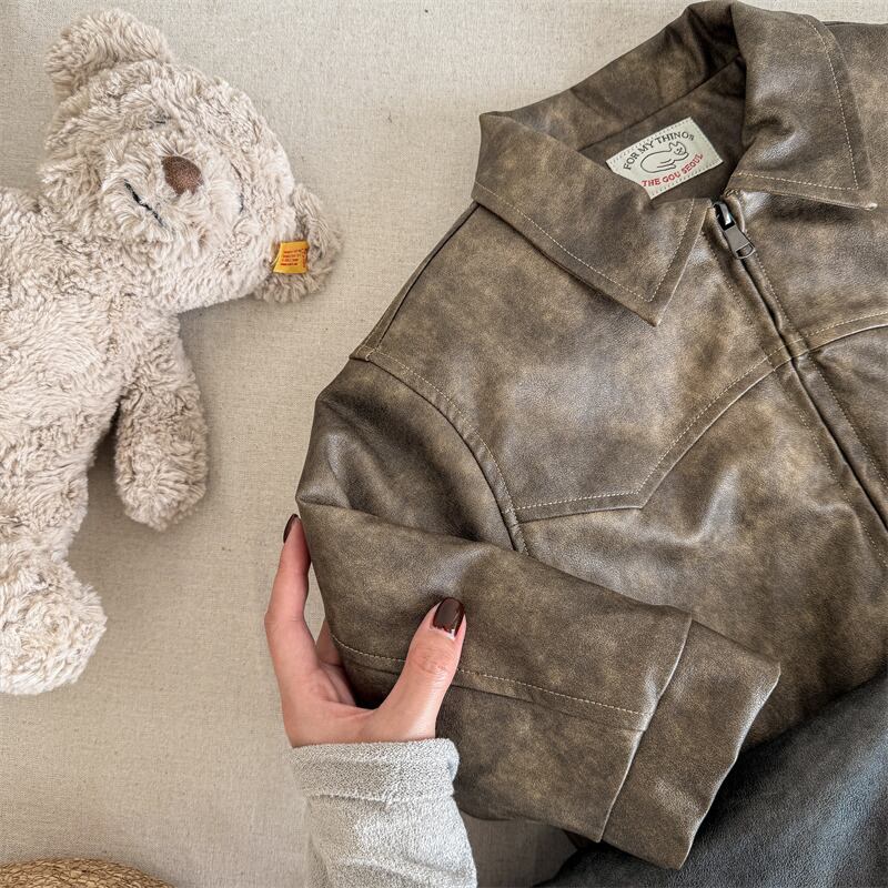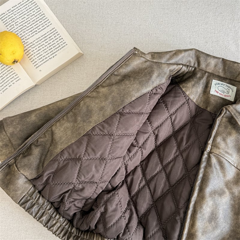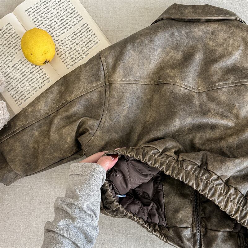 ・ 《取寄》 ユーズド風フェイクレザージャケット (ブラック/コーヒー) ADBB 2024冬 韓国子供服 アウター 古着風 ジャケット ブルゾン コート 合皮 (80~130cm)
