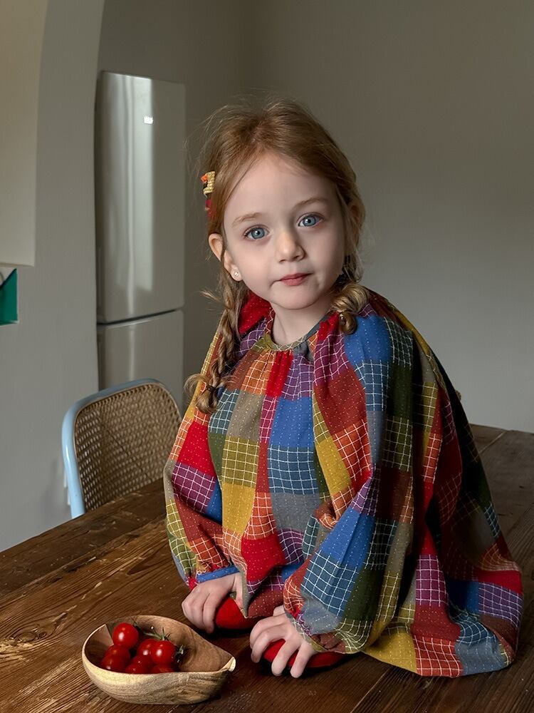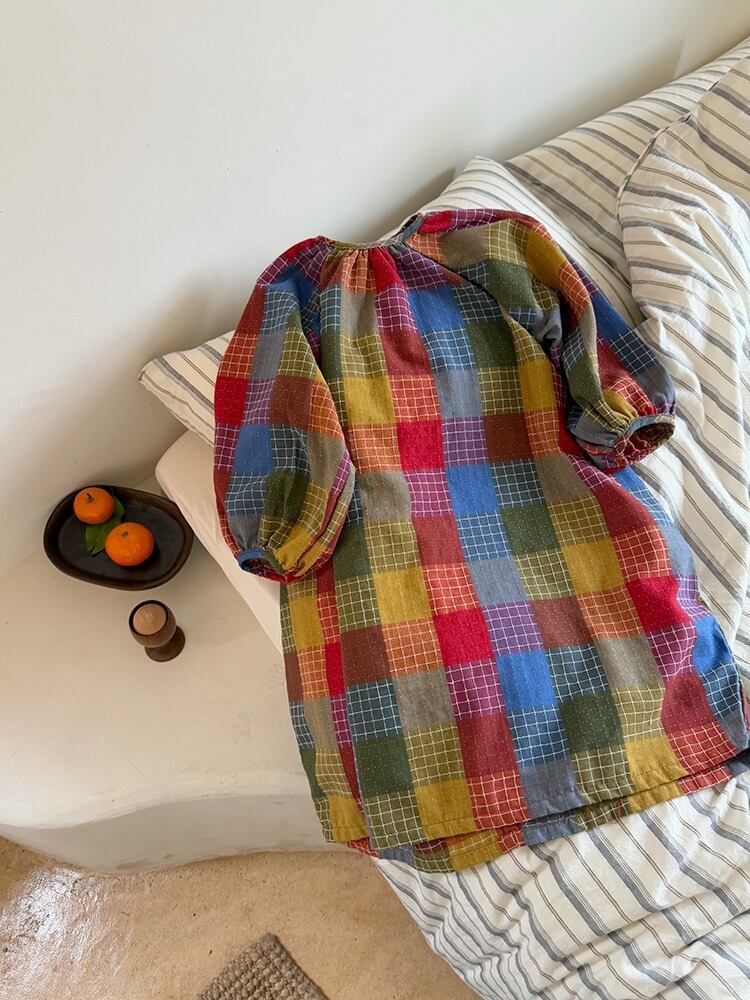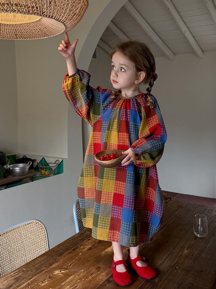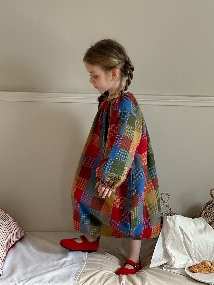 《取寄》 カラフルパッチワーク風コクーンワンピース (カラフル) BOBI 2025春 韓国子供服 ワンピース ワンピ スカート チェック柄 レトロ 女の子 (90~150cm)