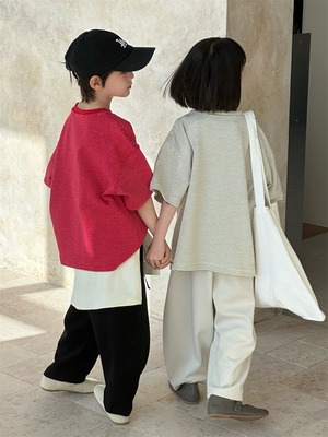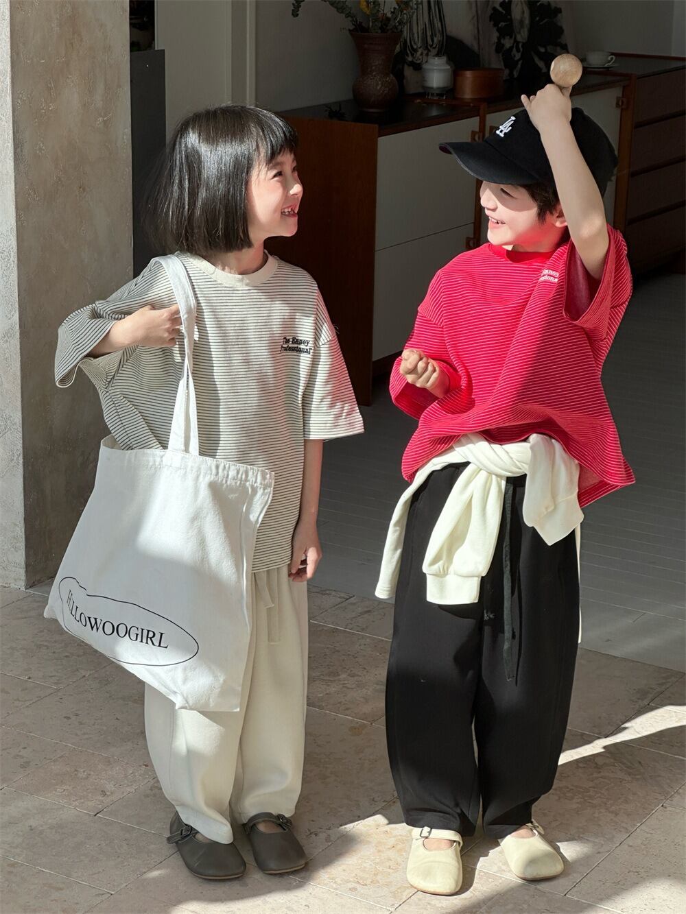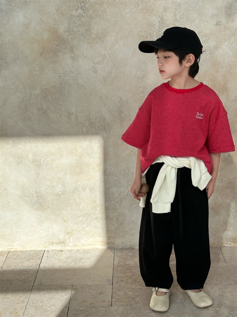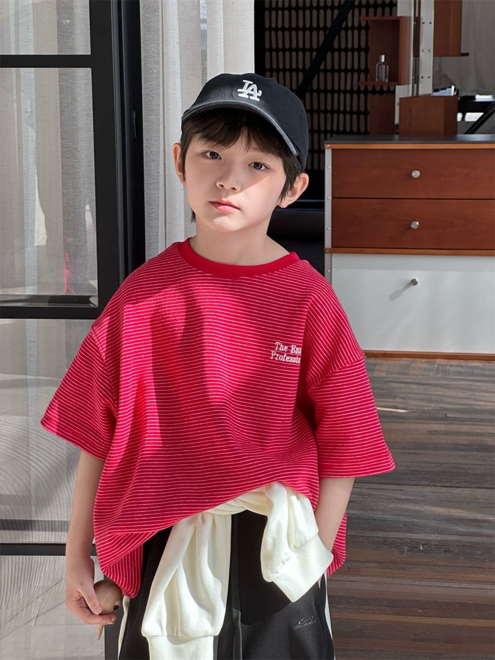 《取寄》ファインボーダーTシャツ (レッド/ホワイト/ネイビー) XDJK 2025春 韓国子供服 トップス Tシャツ カットソー 半袖 オーバーサイズ ゆるカジ (90~140cm)